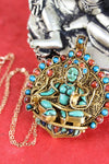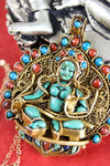 Exceptionally detailed, one-of-a-kind Thai Vermeil pendant that is handmade by our artists in Nepal. Pendant features a hand carved turquoise Green Tara and is garnished with coral and other turquoise accents. Absolutely no detail was spared when making this piece and it certainly does not go unnoticed. Hand stamped traditional Thai symbols are included on the back of the pendant.