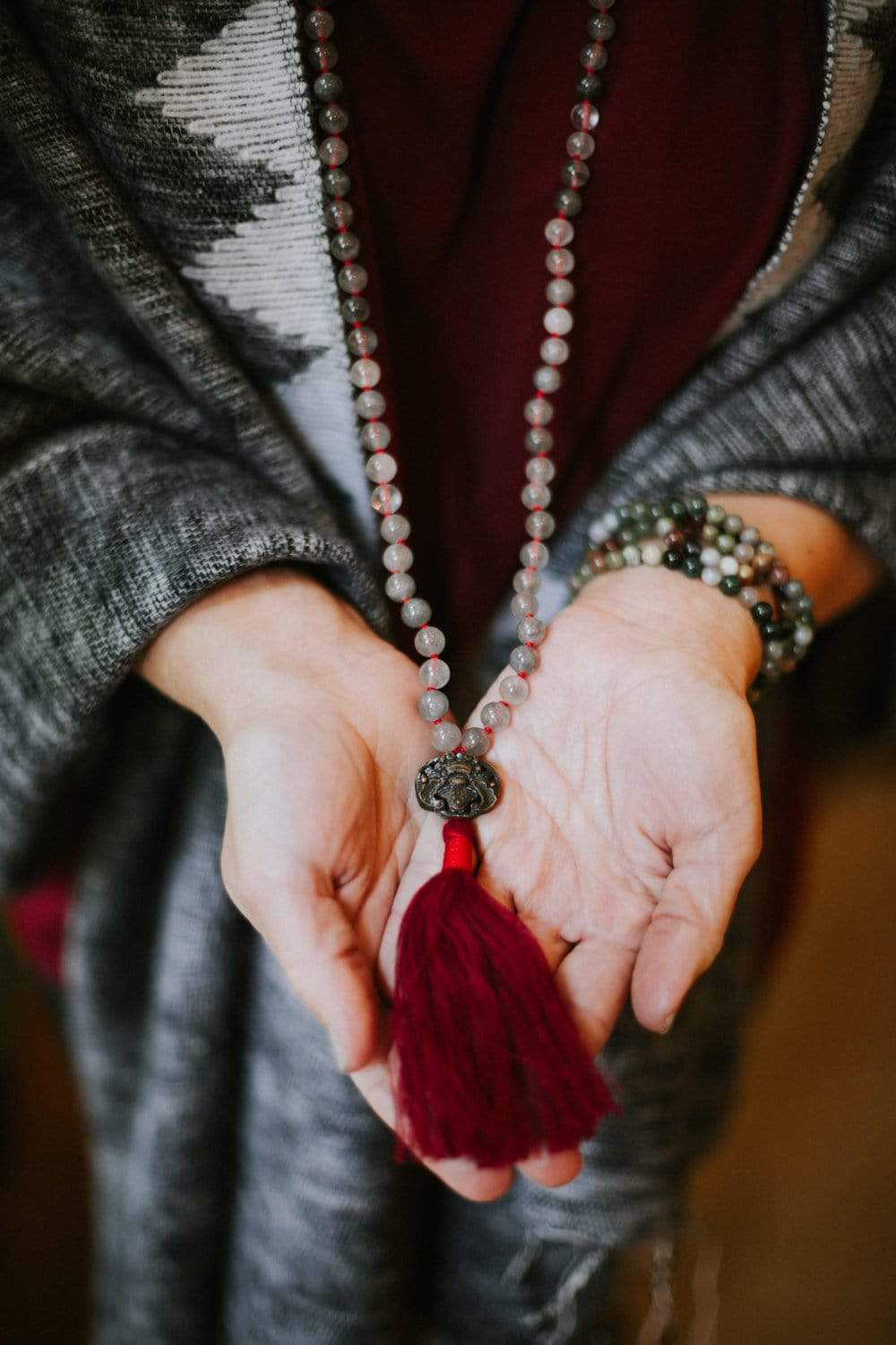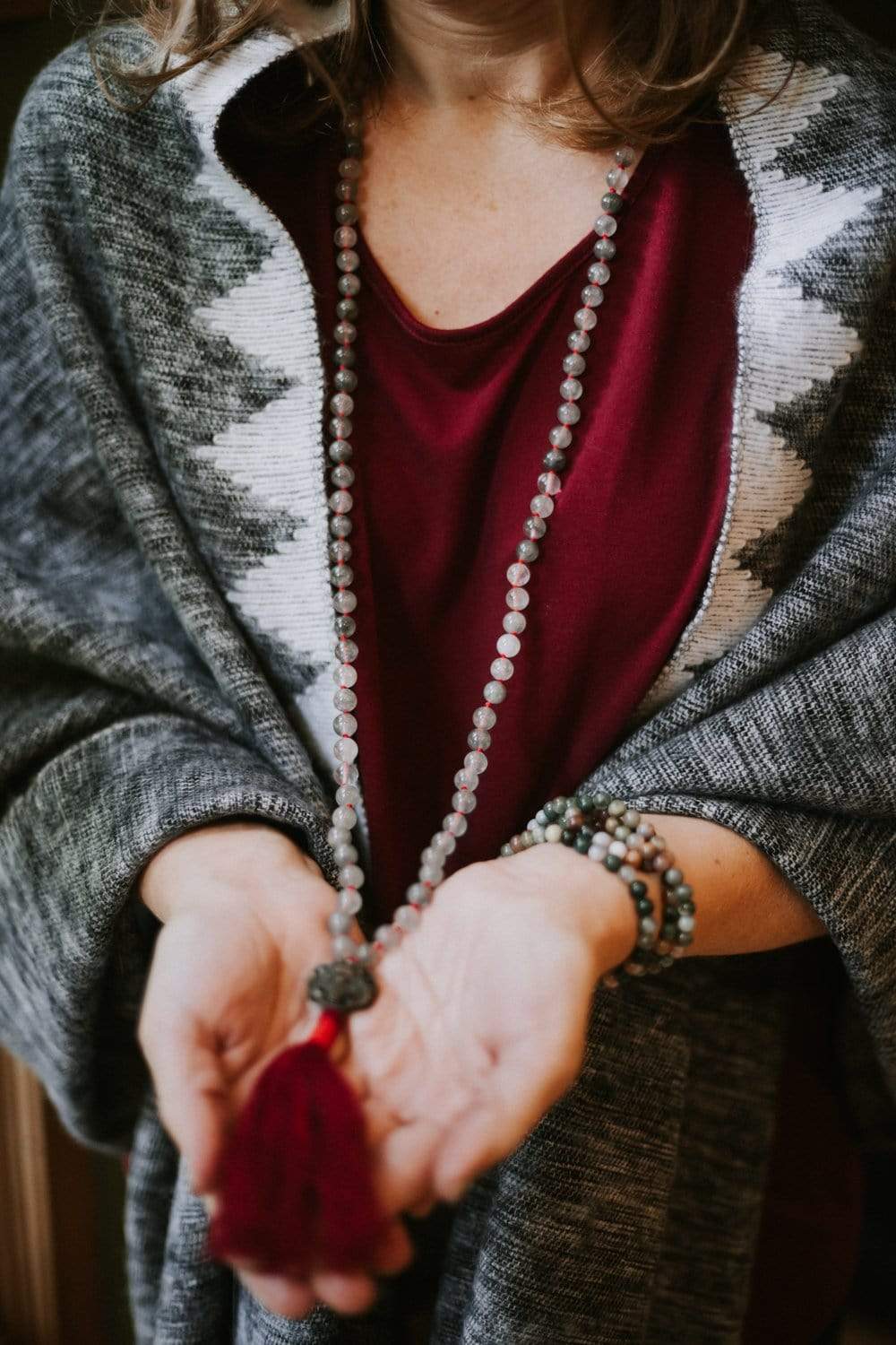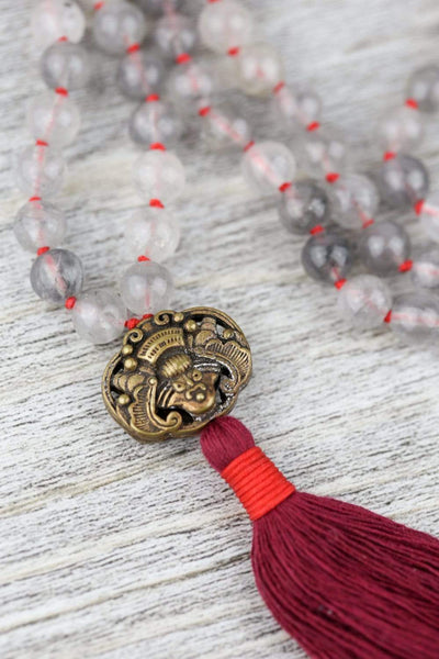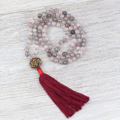 Gray quartz is an excellent grounding stone that aids in concentration, making this hand knotted mala great for meditation practice. It is a powerful stone to activate and purify the Root Chakra as it provides a protective and stabilizing energy to the wearer. Meditating with gray quartz will help you be present in the moment and ground your spirit.