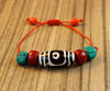 Three eyed dzi bead bone bracelet with resin copal beads strung on red cord. Handmade in Nepal.
