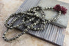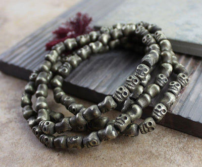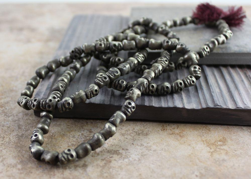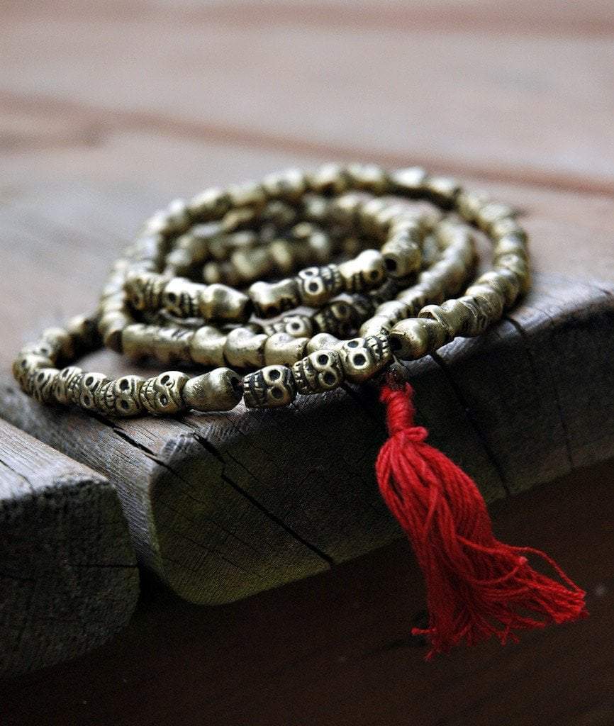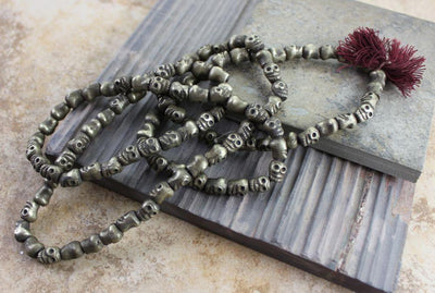 This mala is quite extraordinary. Handmade white metal/brass skull beads feature a red tassel resulting in a soft, lovely color. I bought two of these from a shop in Boudhanath and have since asked if the artisan could send us more. A true, rare gem of a mala. Each skull has a slightly different expression with which to engage and contemplate.