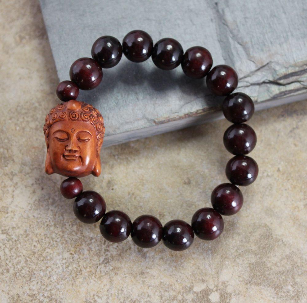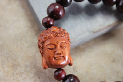 A spectacularly detailed hand carved Buddha pendant string with boxwood beads on a stretchy cord.