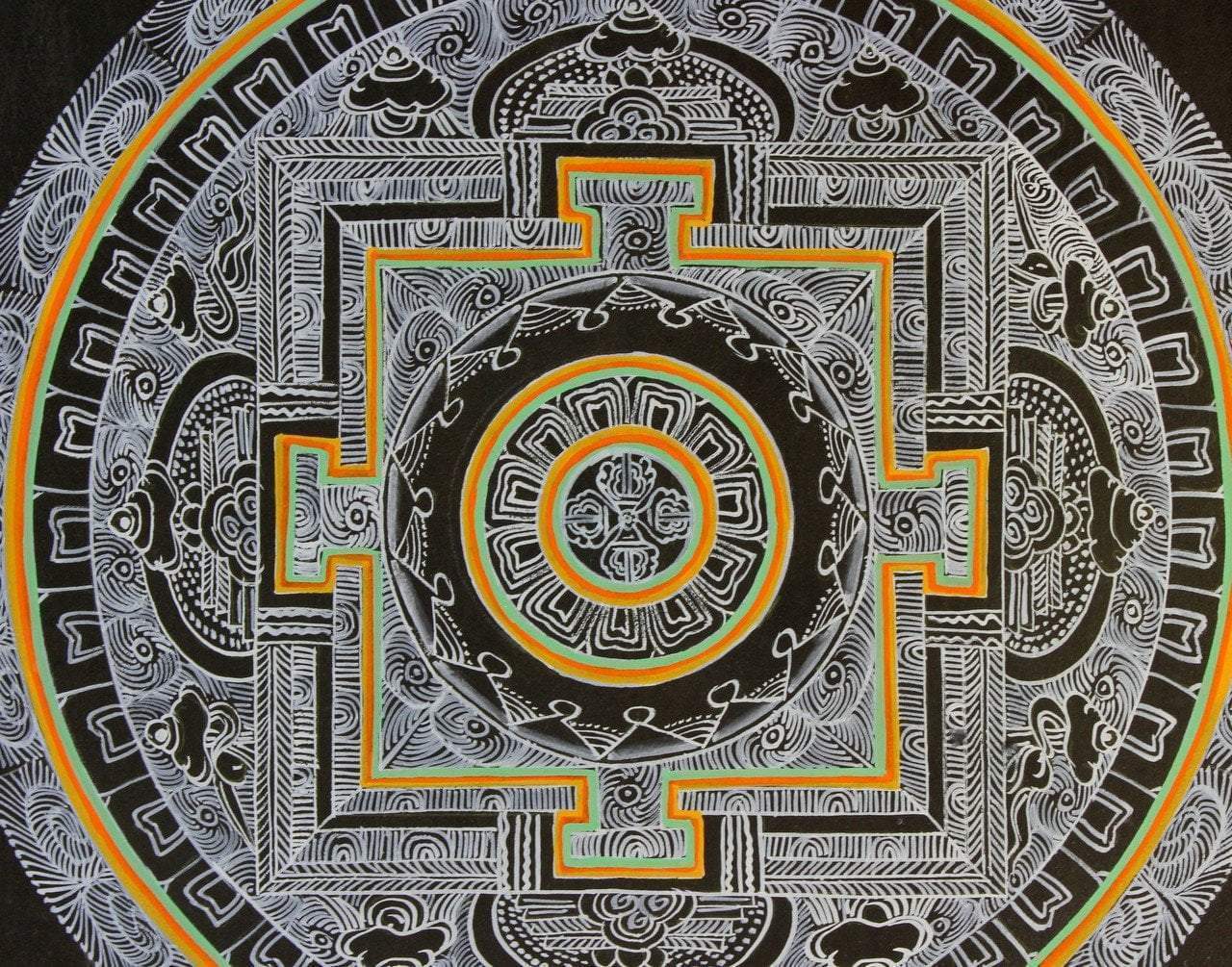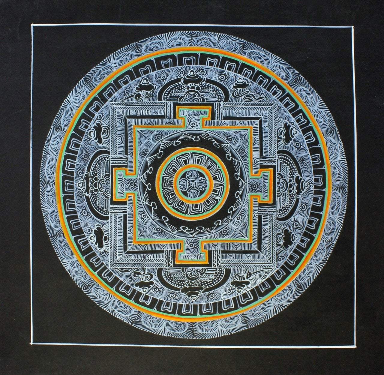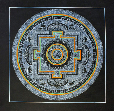 Our new thangka makers continue to send us amazing work! This mandala is handpainted with silver leaf paint with a dorje design at the center.