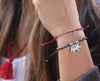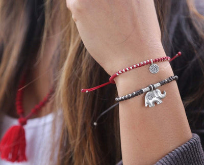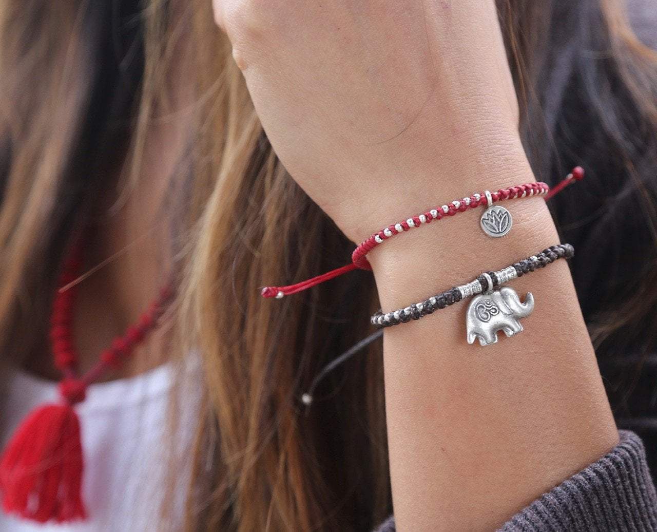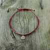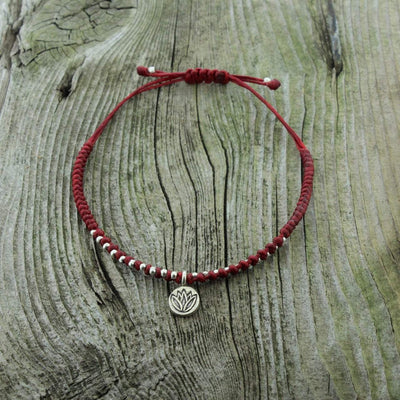 A classic handmade waxed red cord bracelet with Hill Tribe Silver elements and a solid silver lotus charm.