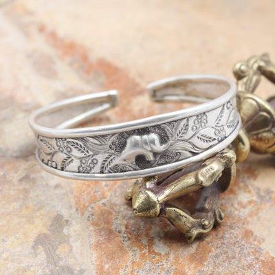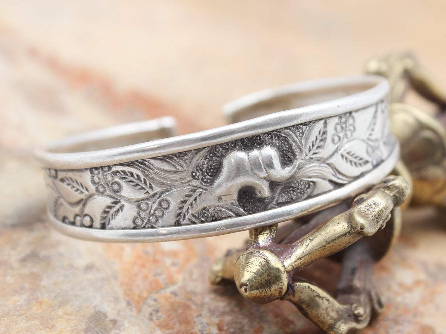 This beautiful one-of-a-kind elephant cuff bracelet is sure to impress! Made with solid .98 Hill Tribe silver from Thailand, it features an absolutely gorgeous hand stamped elephant with floral designs.