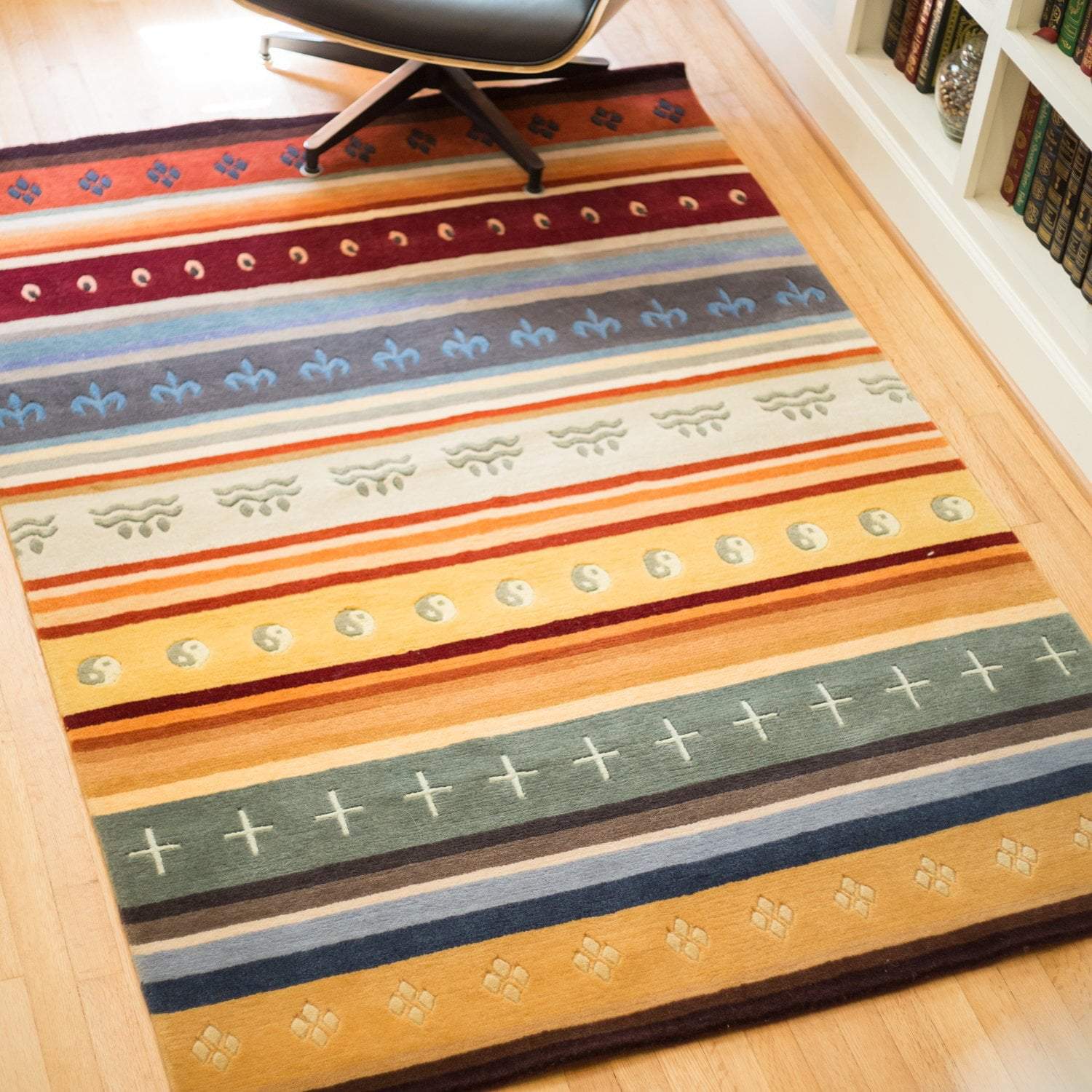 This Tibetan wool Chuba design area rug is gorgeous and one-of-a-kind.  It is the perfect addition to your home, office, or meditation space, and it will last for generations.  Use a cushion and sit upon it during meditation, or use it as a stylish area rug.  It features bold colors with a traditional Chuba design.  A Chuba is the traditional dress of Tibet.