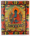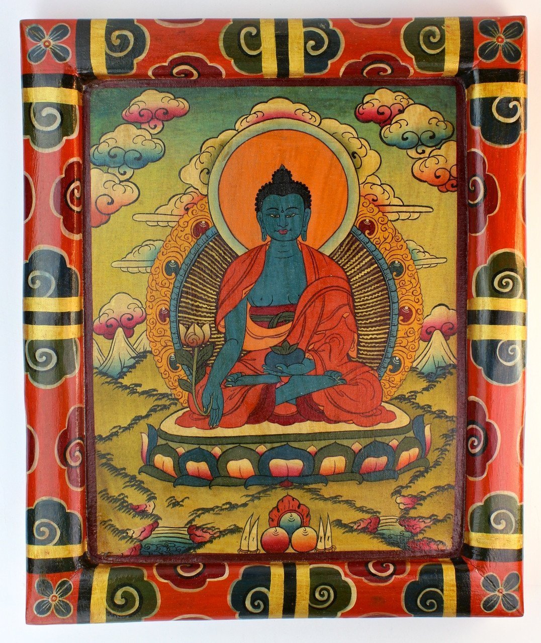 Exquisite wood painted Medicine Buddha Thangka. This masterpeice is hand painted in Kathmandu Nepal by a Thangka master.