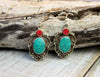 Beautifully handmade Tibetan silver earrings are with inlaid turquoise and coral stone.