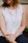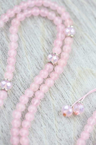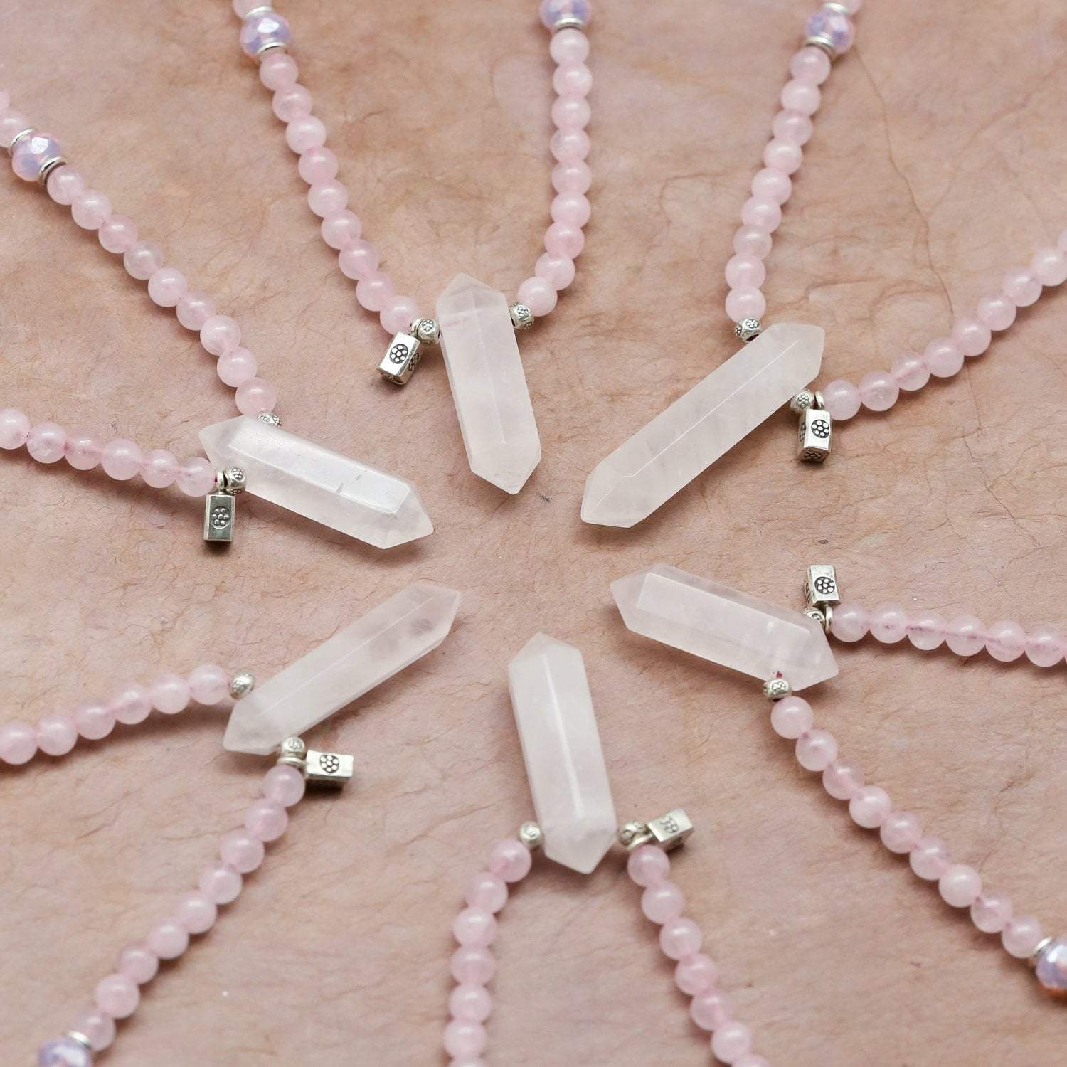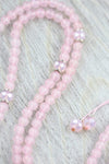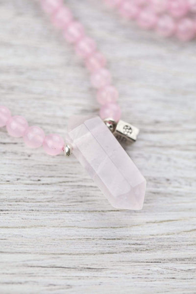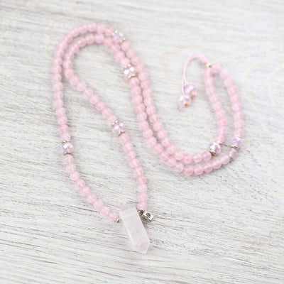Mala measures approximately 29 inches around. Rose quartz beads are 6mm, Czech glass beads are 8mm. Gemstone pendants range from about 1 1/2 - 2 inches in length. *As each pendant is handmade, style or shape may vary slightly - please let us choose.*