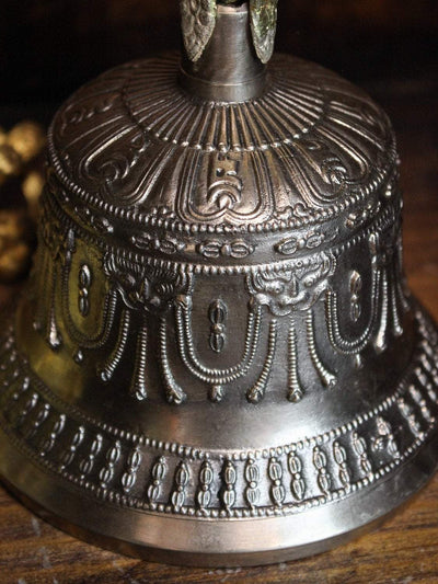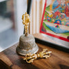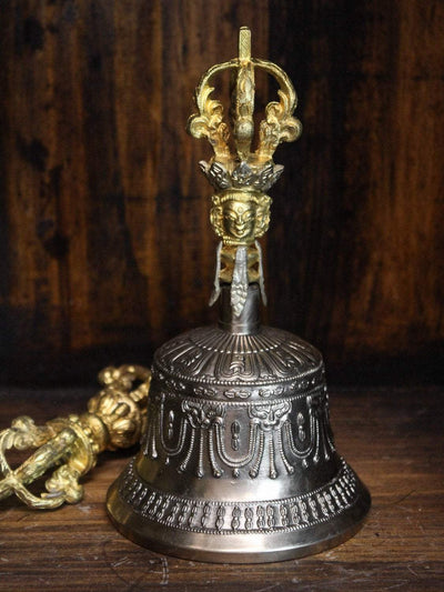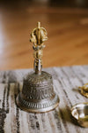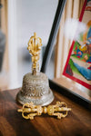 Bell measures approximately 9 inches tall and 4.5 inches wide. Dorje is about 6 inches long. Handmade in Nepal.