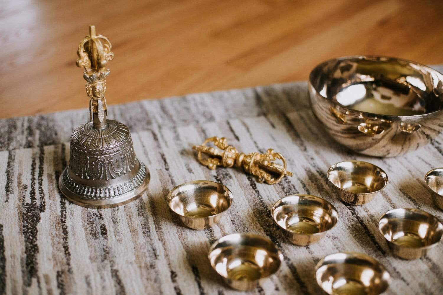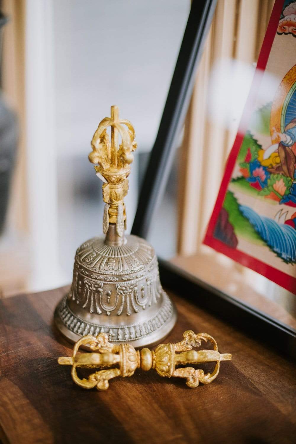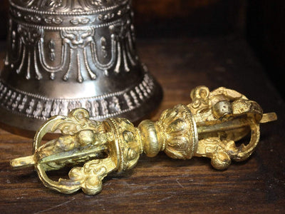 The hollow of the bell symbolizes the wisdom cognizing emptiness. The clapper represents the sound of emptiness. The eight lotus petals are the four mothers and four goddesses, and the vase represents the vase containing the nectar of accomplishment. Paired with the dorje, the bell represents wisdom, and as wisdom and method are an undivided unity so the Dorje and bell are never parted or employed separately.