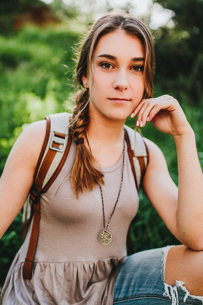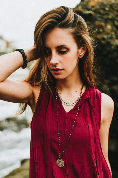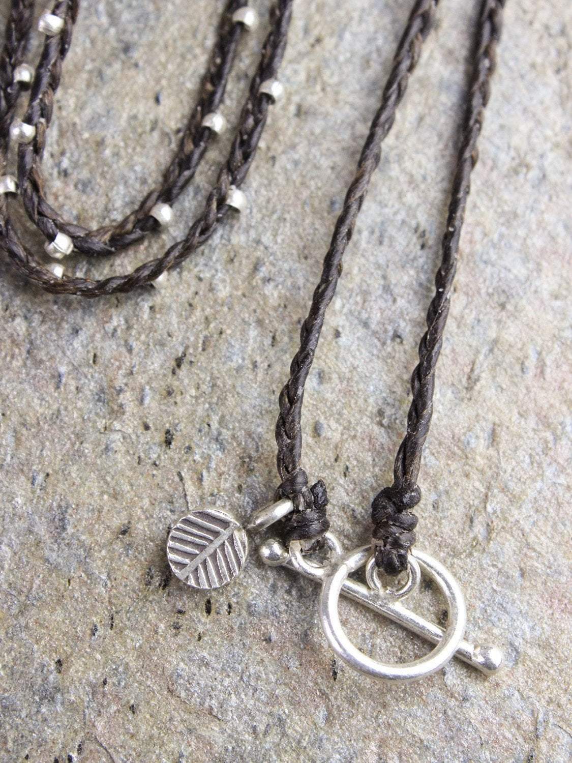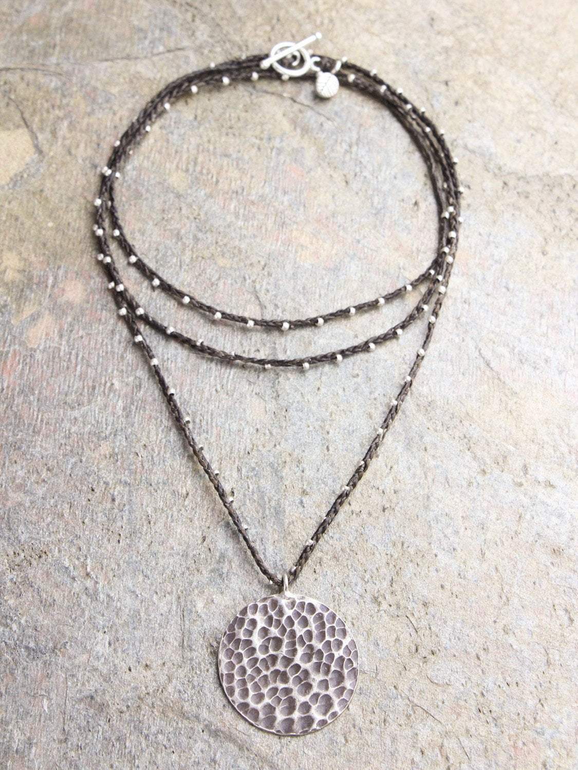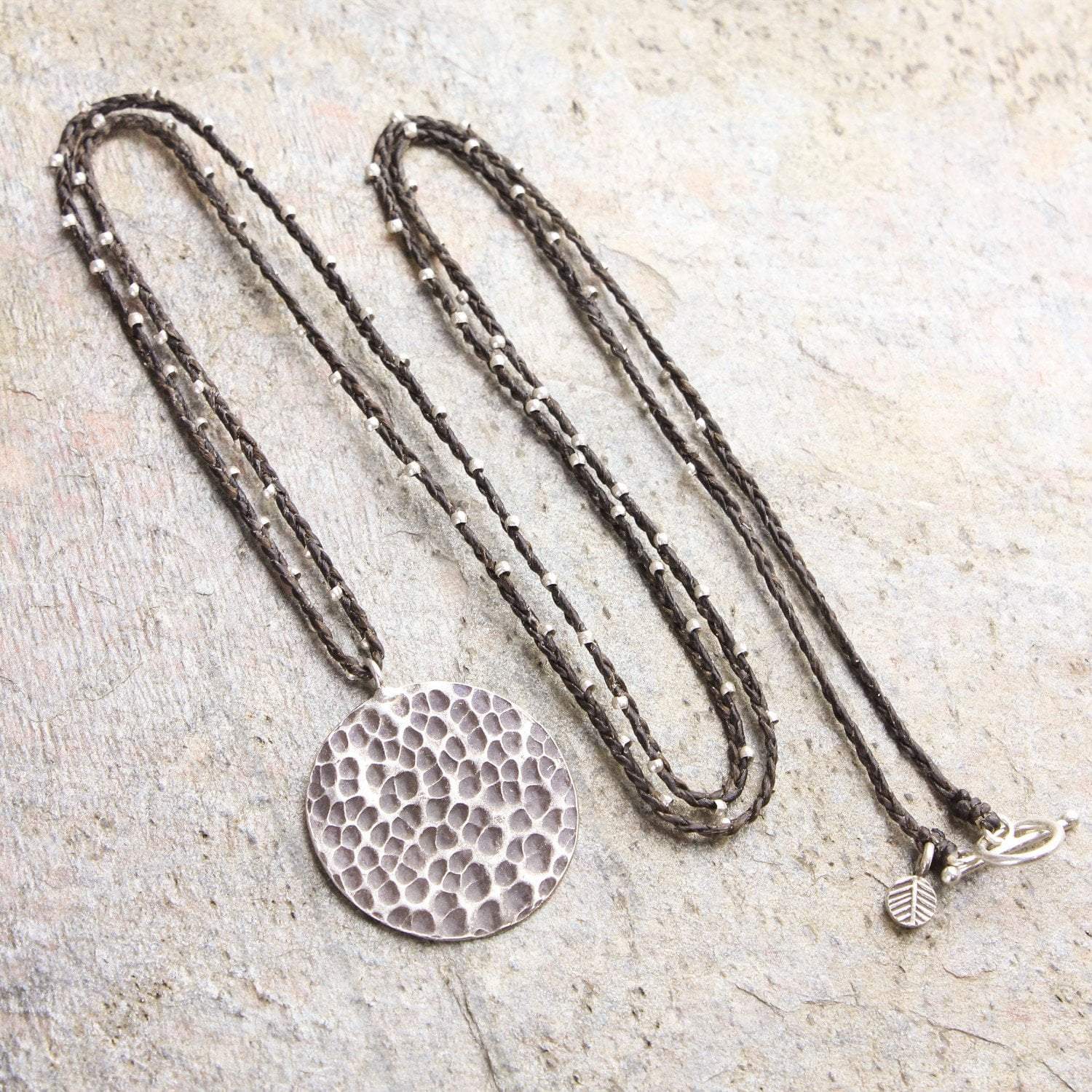 • It features 98% pure Hill Tribe silver elements including a hand hammered medallion style pendant, a leaf stamped charm near the closure, and beautiful accent beads woven into the brown waxed linen cord.