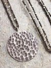 • The hand hammered texture on the medallion brings to mind a picture of soft stone pebbles in a lake.  Accompanied by the stamped leaf charm, the elegant design of this necklace reminds us of our connection to nature.