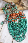 Coral and turquoise envelop this hand made necklace that features two silver hand-inlaid sphere pendants. Includes a turquoise stone loop closure.