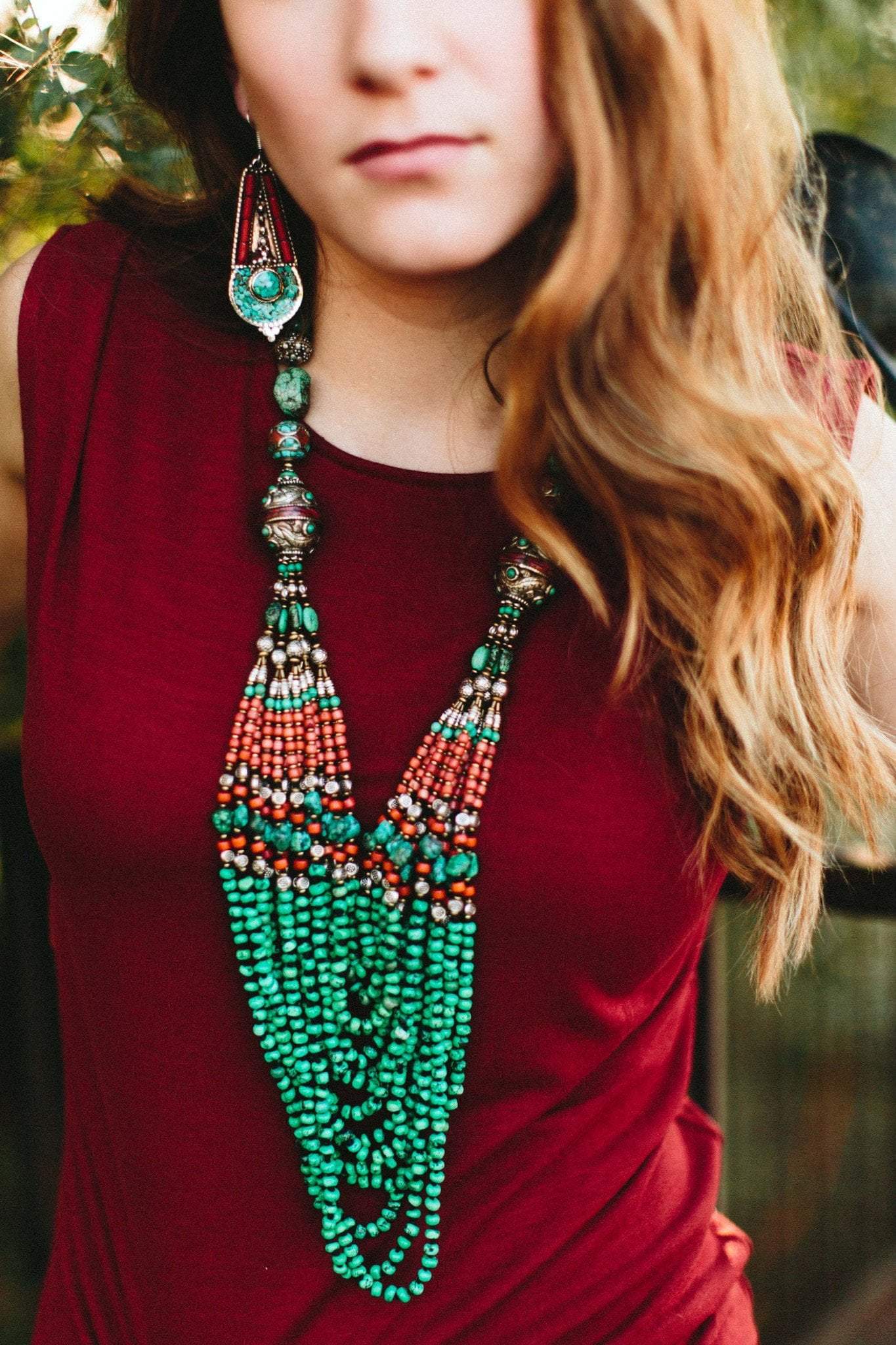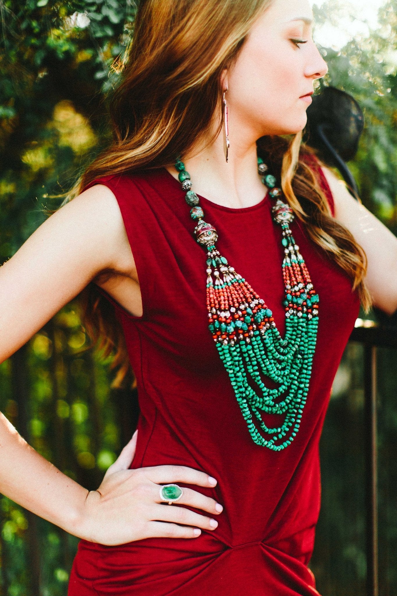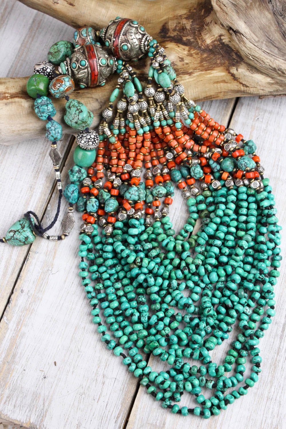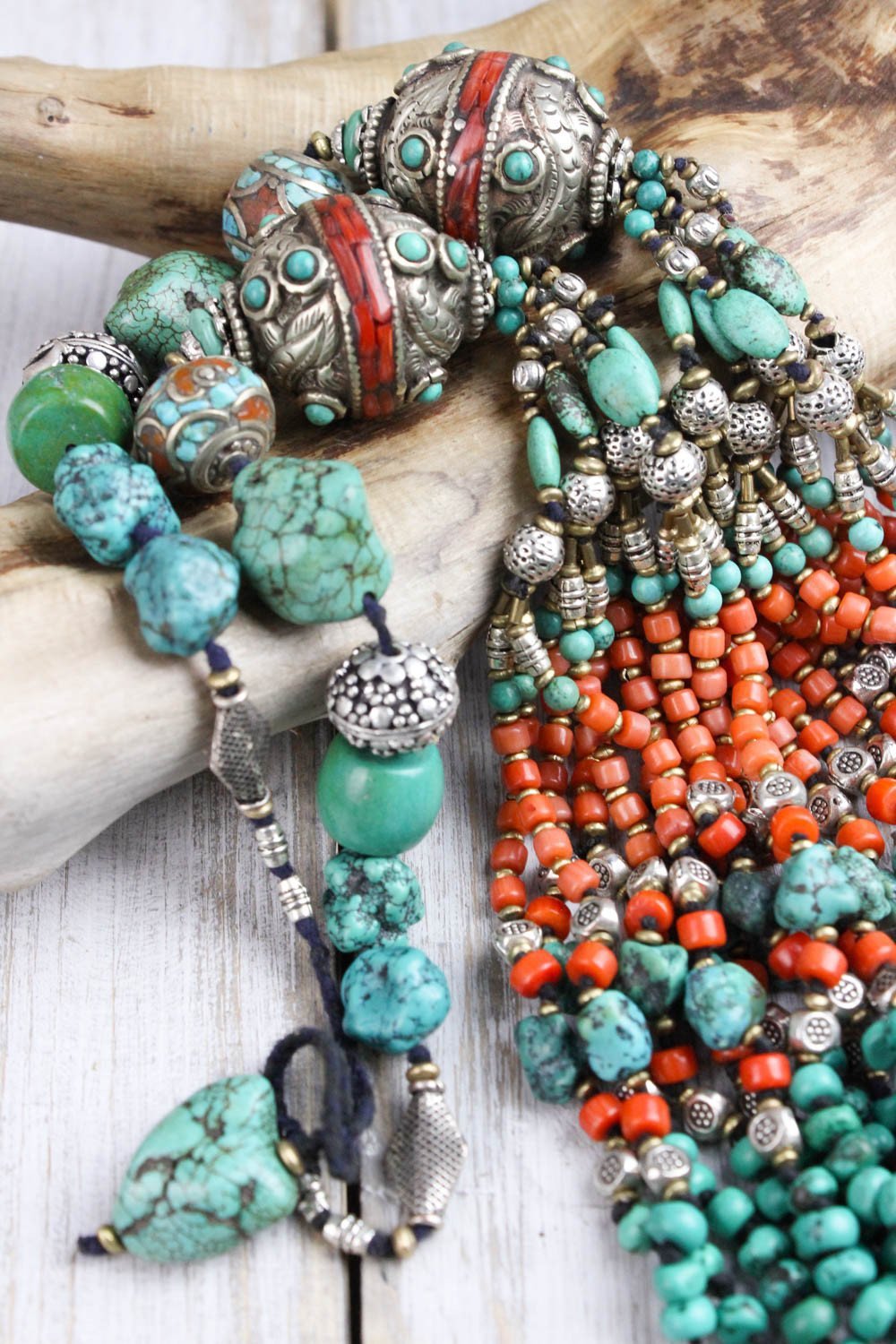We worked directly with our artists in Nepal to create a range of stunning, one of a kind necklaces that inhabit the spirit of Tibet. Using antique and modern elements, this necklace is a bold and colorful statement piece that will never go out of style. Worn with formal wear or a casual denim shirt, Tibetan jewelry looks almost southwestern to our sensibilities as the design aesthetic is so similar.