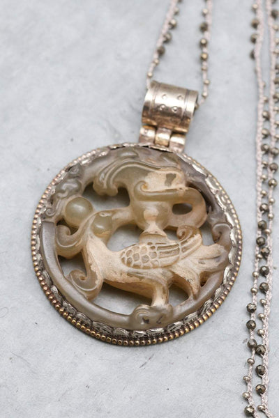 This jade pendant necklace is truly exquisite! We only have 1 available! It features a phoenix design on a beautifully carved jade pendant from Nepal. It is fixed inside of an etched silver-plated brass setting and hangs from a hand woven chain from Brazil. The chain features tiny faceted pyrite gemstone beads.