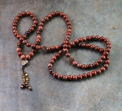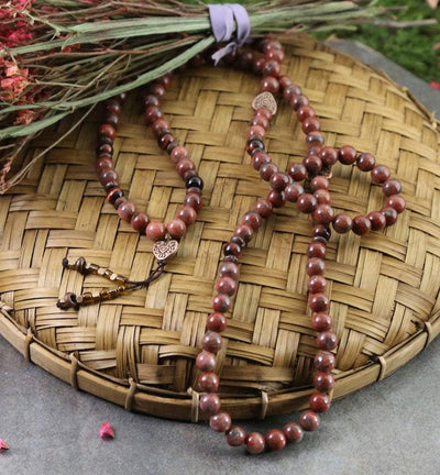 A beautiful mala with depth and subtle colors, deep red jasper with 4 Tibetan copper spacers and amber and wood bead tassel