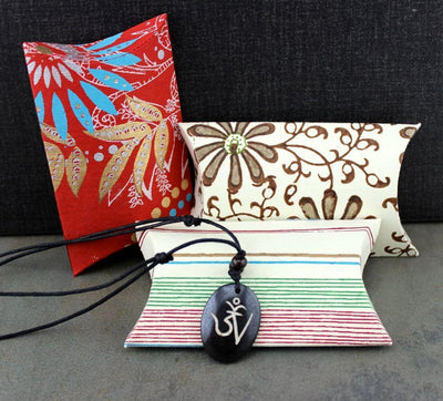 These boxes are a great fit for many of our smaller jewelry items.  They are handmade, paper-free, Fair Trade crafts from India.  Instead of using paper, which can damage ecosystems, the material used here is recycled cotton cloth.