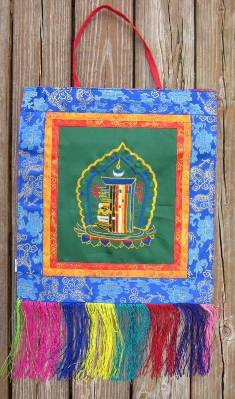 This embroidered fabric wall hanging is an excellent piece for a small mediation or yoga room. While the green background is consistent on each piece, the embroidery colors will vary. A wooden dowel is sewn into the top and fabric loop allows for easy hanging. Multicolored fringe hangs from the bottom.