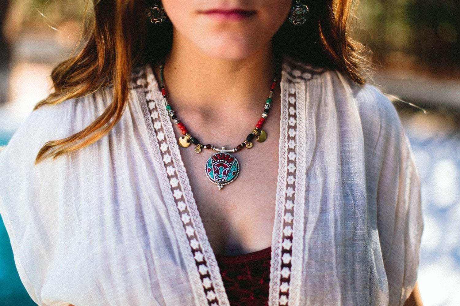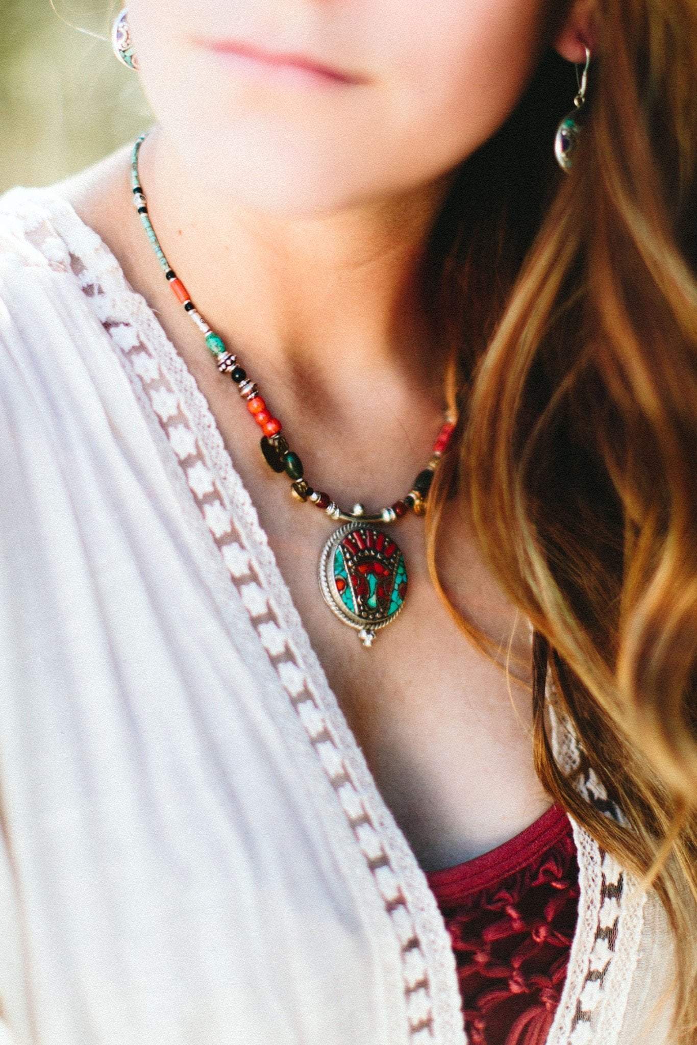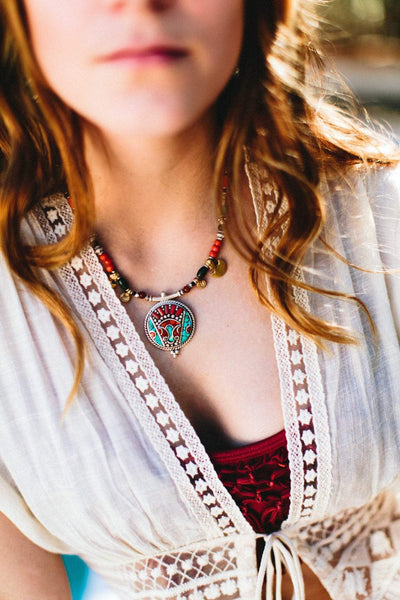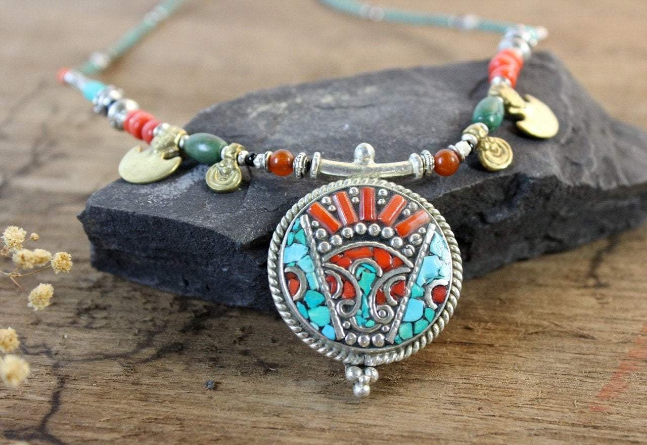 This awesome Tibetan necklace is unique in that it features gold colored accents strung with coral and turquoise beads. The focal pendant is a traditional Tibetan bead inlaid with coral and turquoise. This beautiful necklace was created by Qazi in Kathmandu, Nepal.