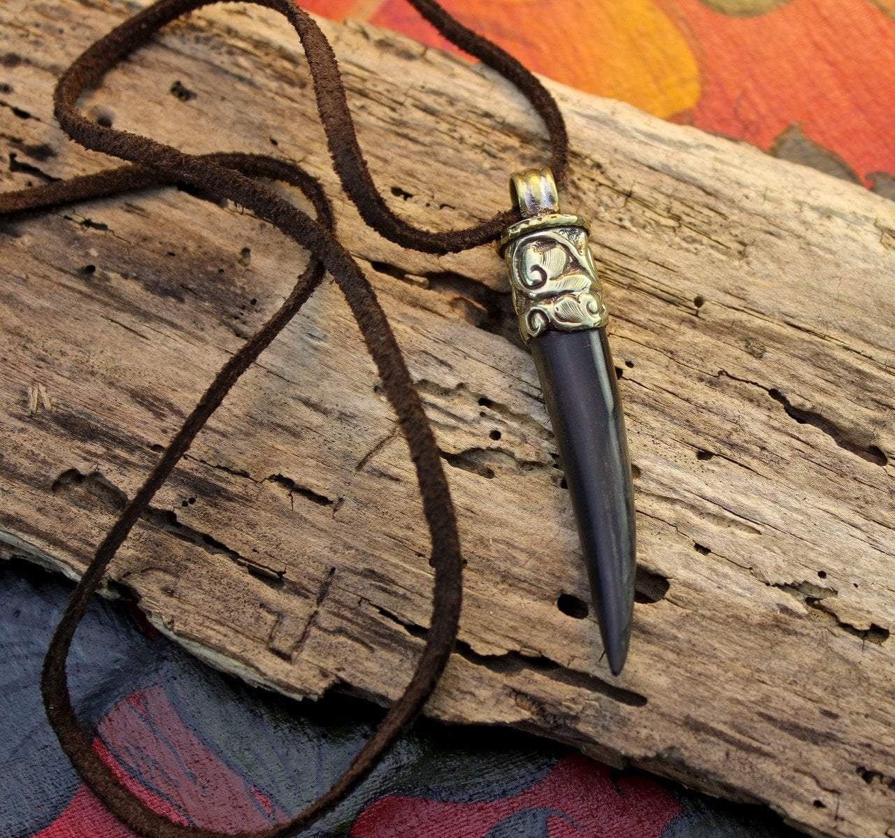 Simple water buffalo horn necklace. Horn is strung on dark brown leather cord.