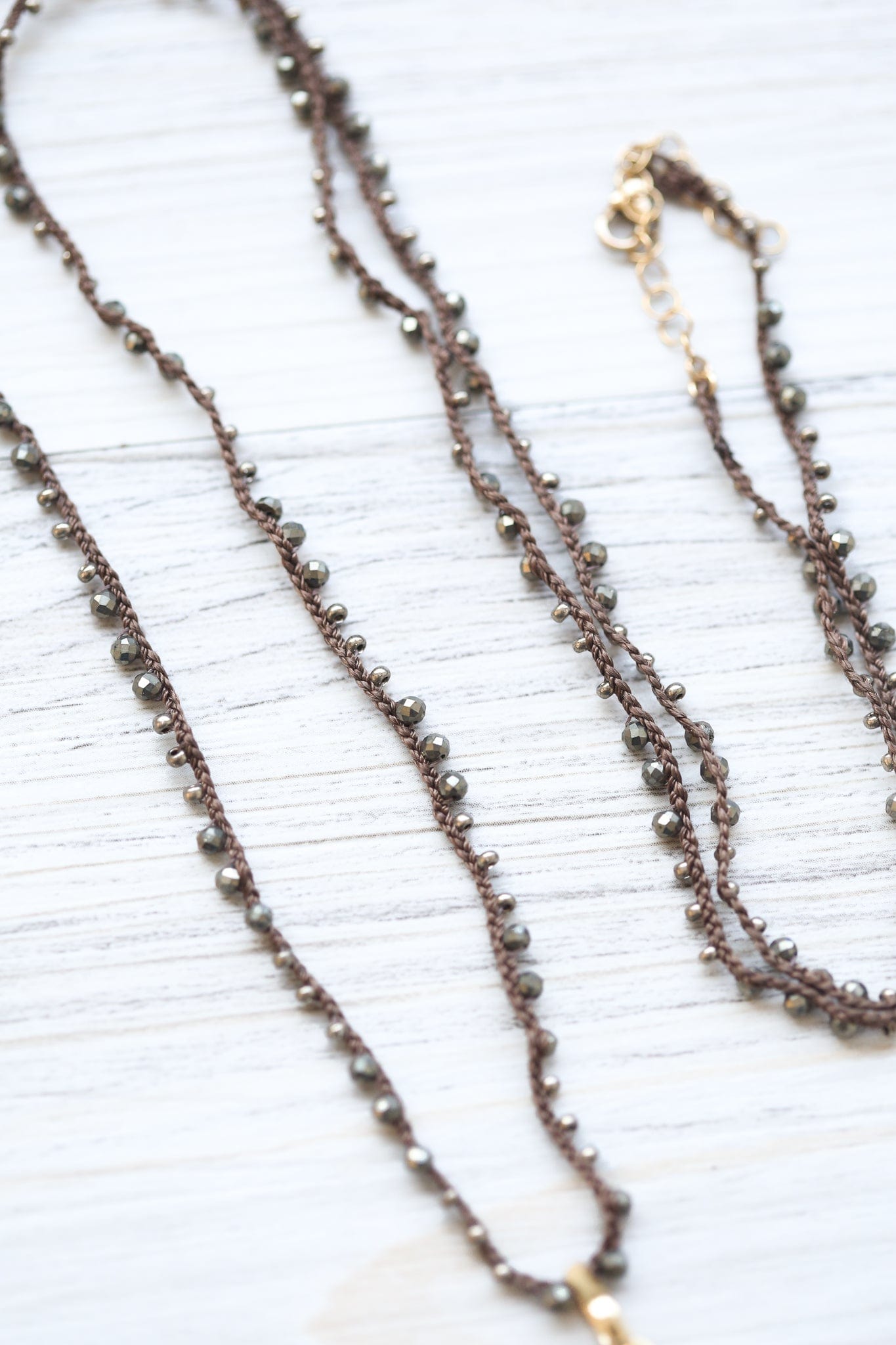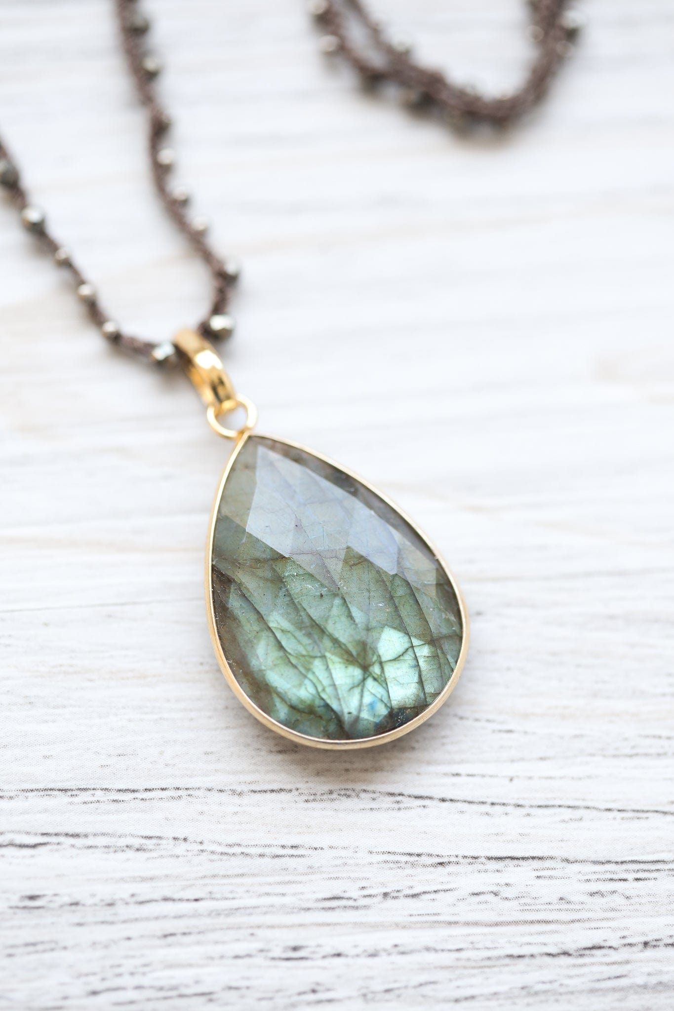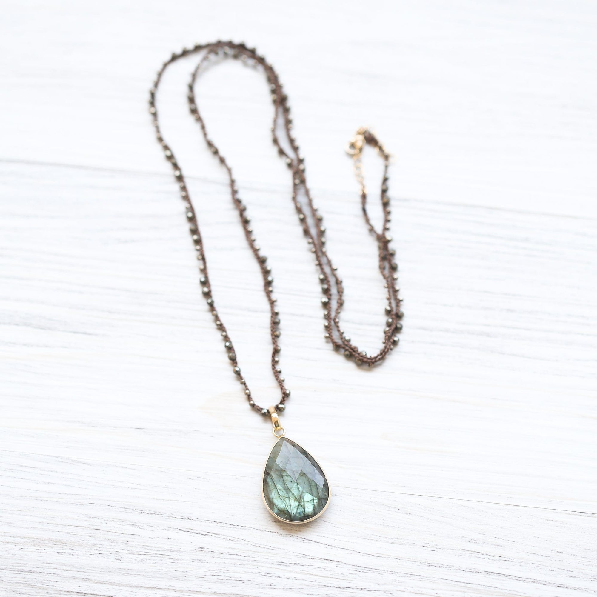 • It features a stunning Labradorite and Gold Vermeil teardrop shaped pendant from India on an intricate, hand-woven chain from Brazil with Pyrite.