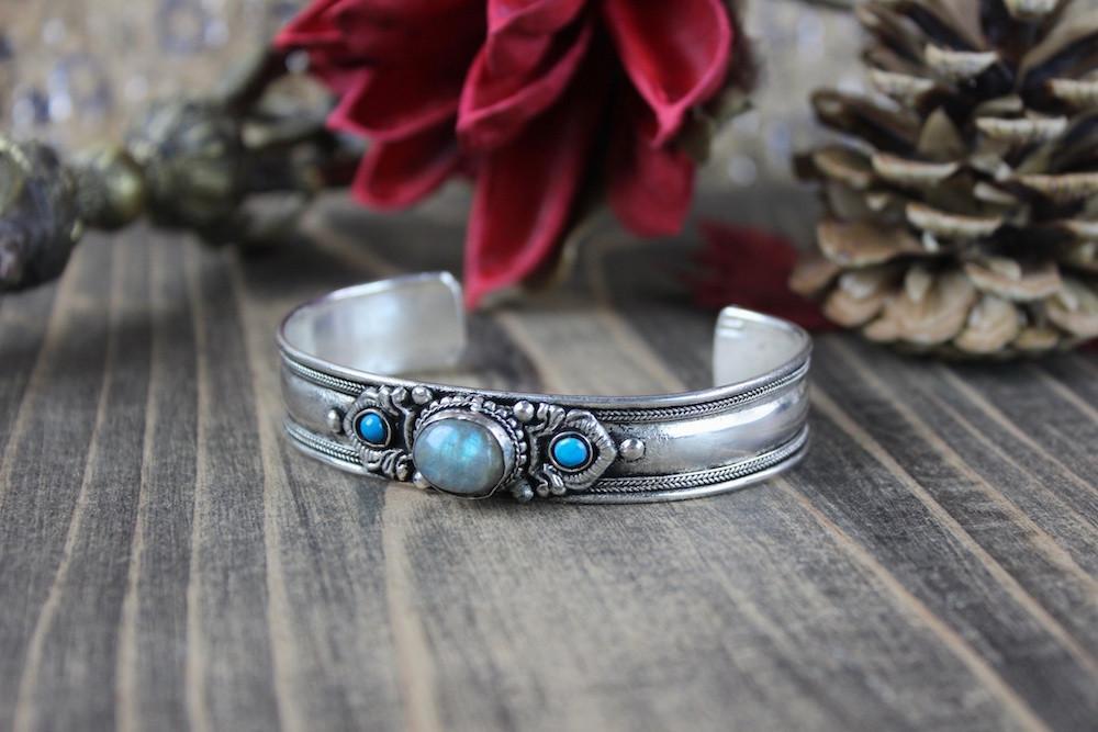 Labradorite stone has been used for centuries by healers and spiritual students for guidance during spiritual practice and discovery. The shimmering stone is layered with color and iridescence. Here this lovely stone is flanked by two faux turquoise stones set in detailed metal scroll work.