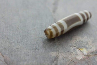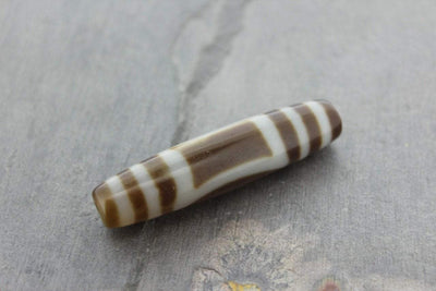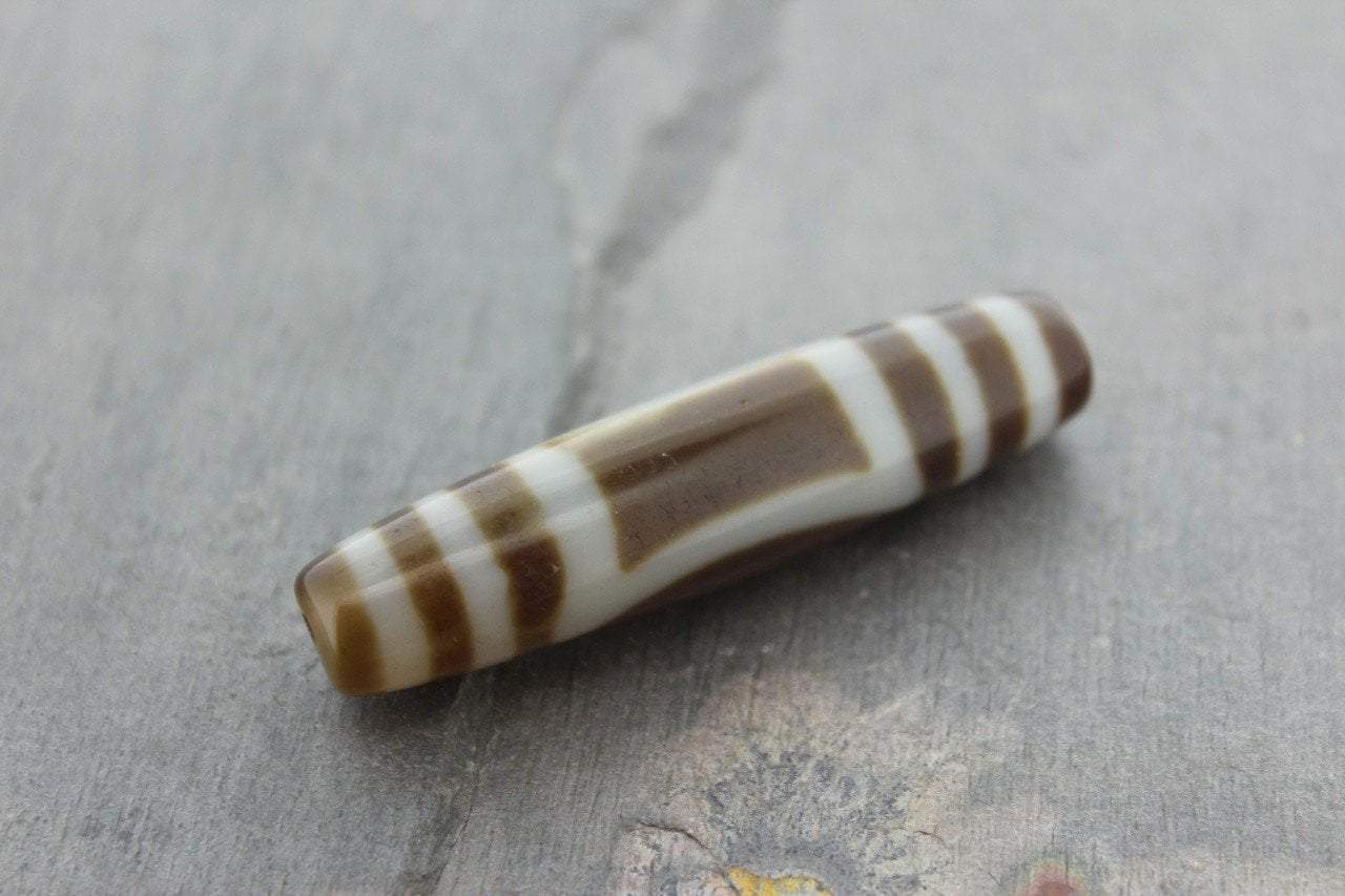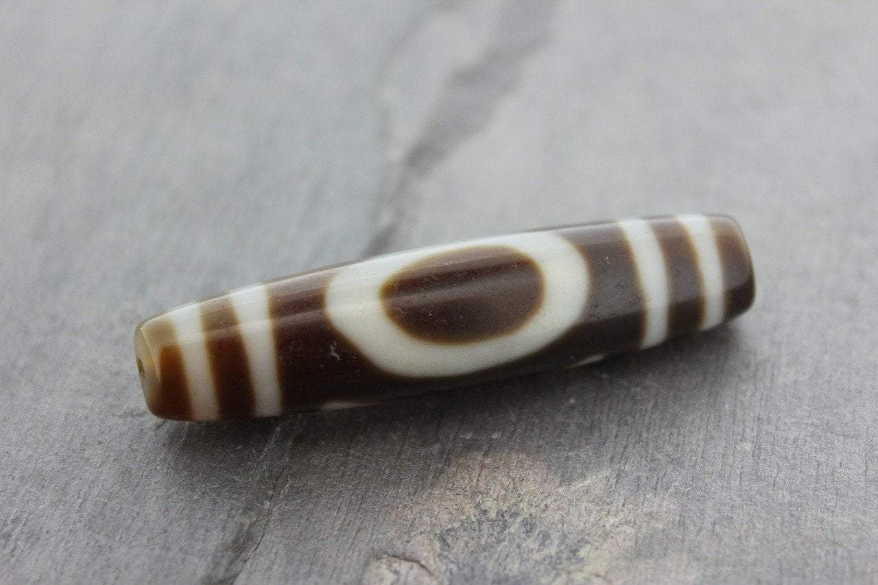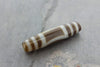 An amazing Sakor Namkor (sky door) dzi bead with light caramel ends are irregular drill holes. Stunning agate banding under the designs and light occlusions.