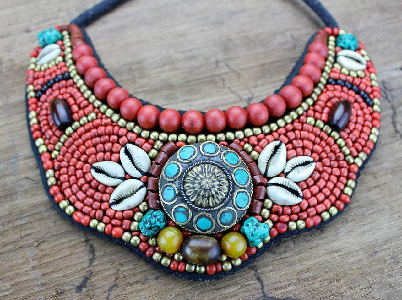 These traditional necklaces are making a comeback in Tibetan communities around the world. Ancient versions of these necklaces had thousands of dollars worth of trade beads, our modern version is all hand made in Nepal. One of a kind.