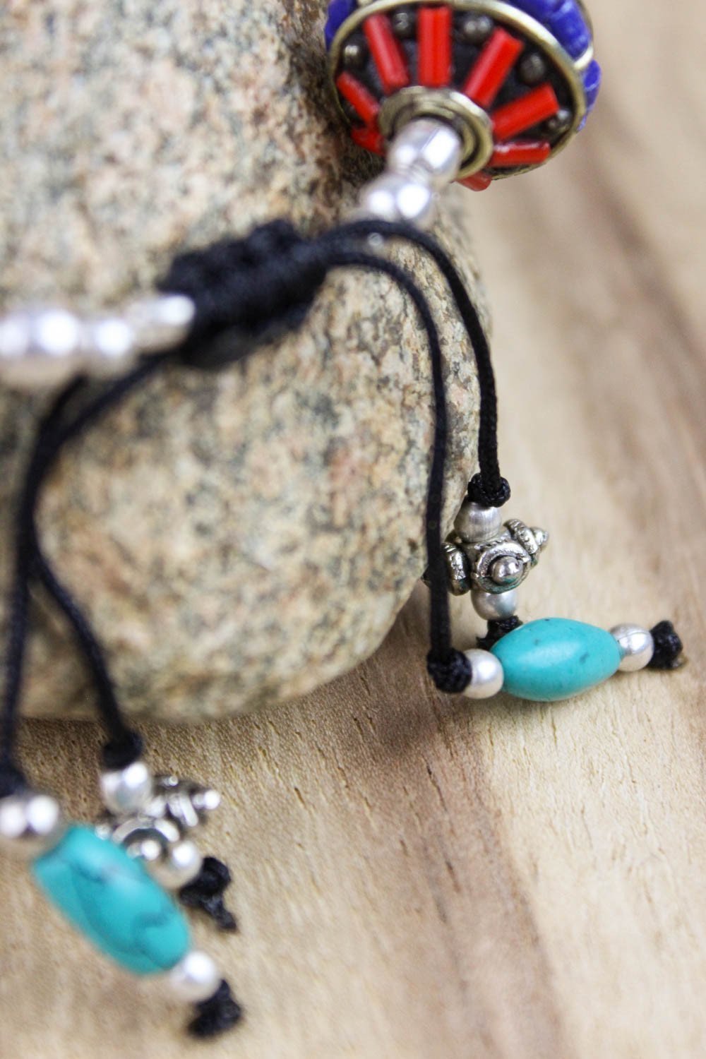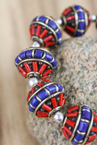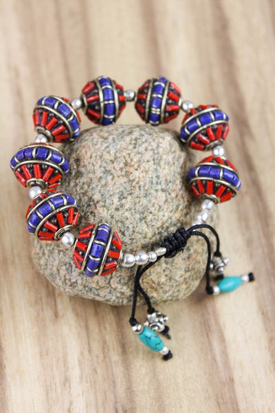 Hand-inlaid lapis and coral bracelet features 8 large beads strung on black cord. This traditional style Tibetan bracelet is a gorgeous statement piece to add to your jewelry collection. Lapis is a powerful crystal for activating the higher mind and enhancing intellectual ability. It stimulates the desire for knowledge, truth and understanding, and aids the process of learning. It is also excellent for enhancing memory.