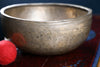 This exceptional, museum quality Jambati singing bowl features a thick rim and a low profile design with tuning marks around the outer rim and a golden finish. It is an extra large sized, beautifully aged, visibly hand hammered singing bowl. Jambati are among the largest of the Himalayan singing bowls with outward sloping sides and a relatively small base.