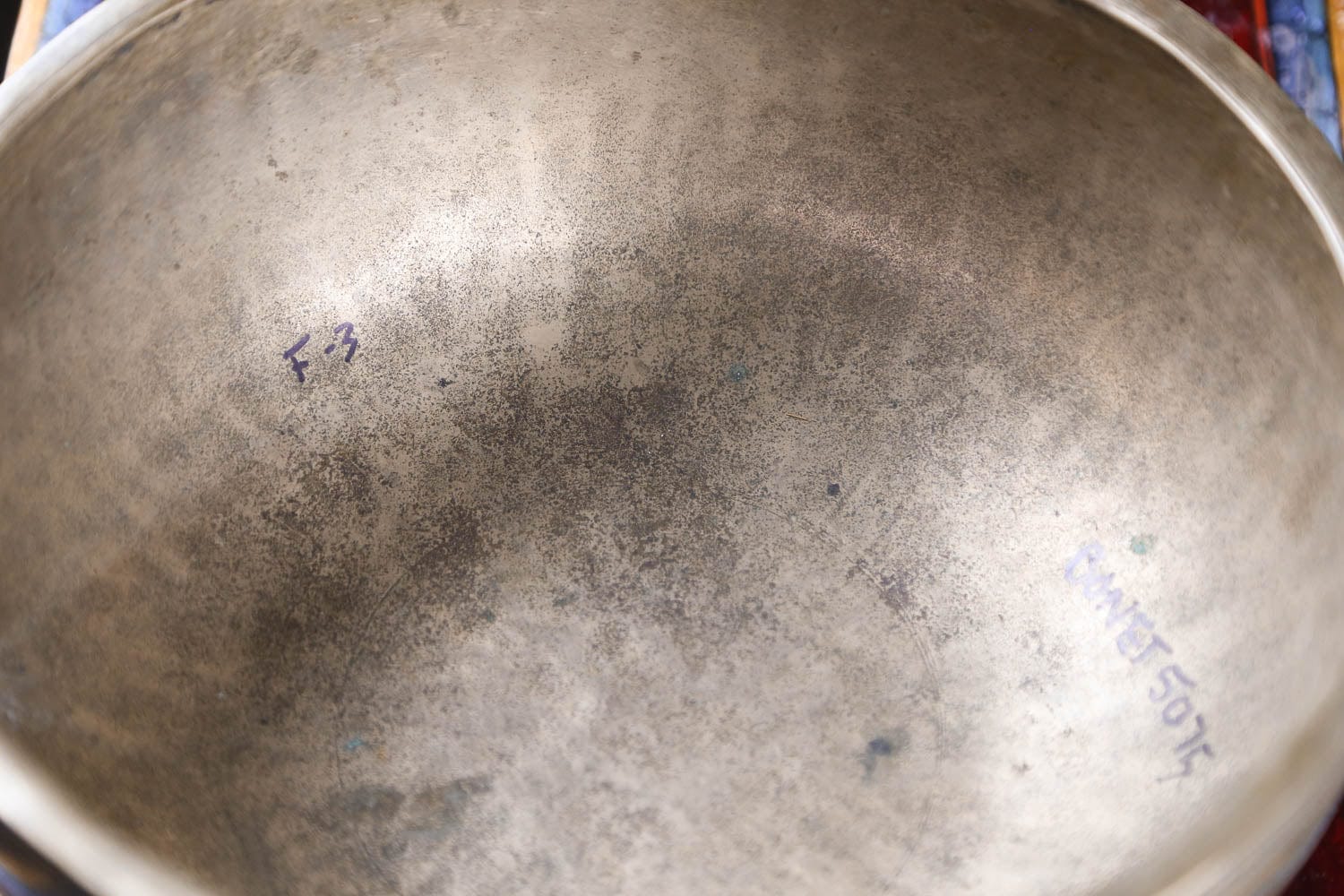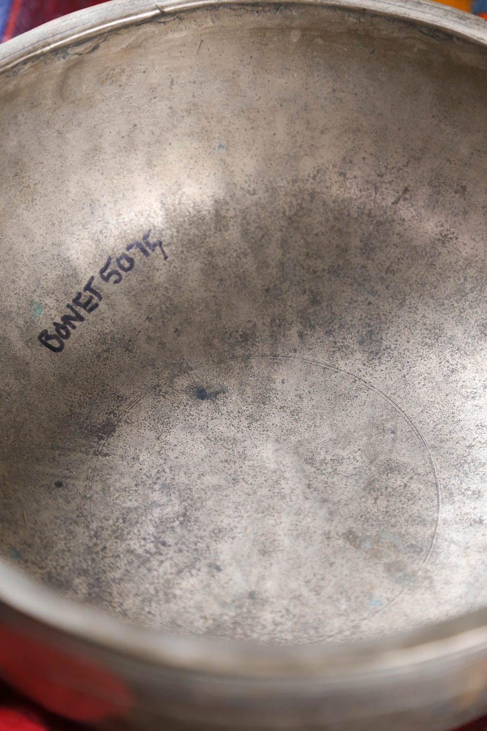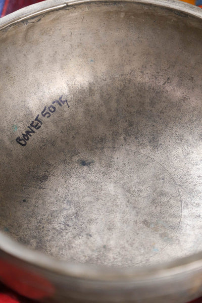 Each singing bowl from the Lost Collection features a unique identification number that links it to the rare antique collection. In this case, it can be seen along the inside rim of the bowl.