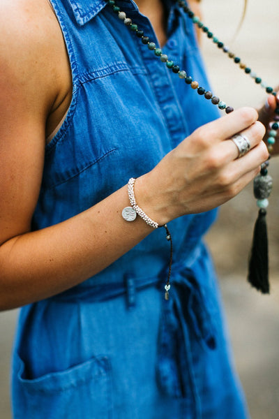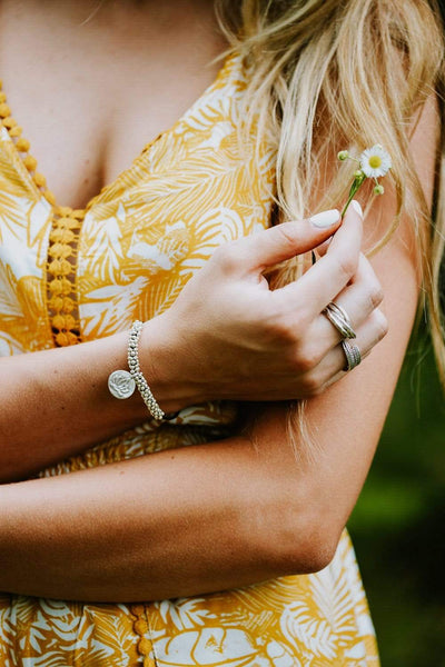 Adjustable bracelet opens to about 8 inches around and tightens to fit your desired size. Entirely sourced and handmade in Thailand.