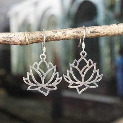 Stunning sterling silver lotus flower earrings hang from sterling French wires and are sure to impress. A gorgeous design, the lotus flower outline pairs well with both formal and casual outfits.