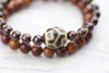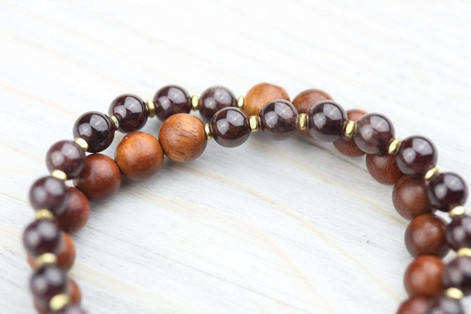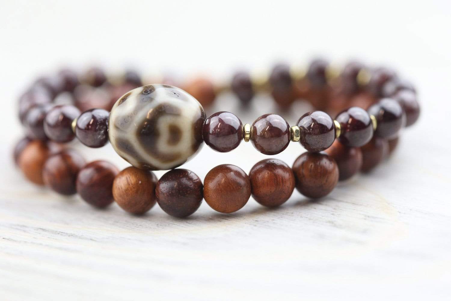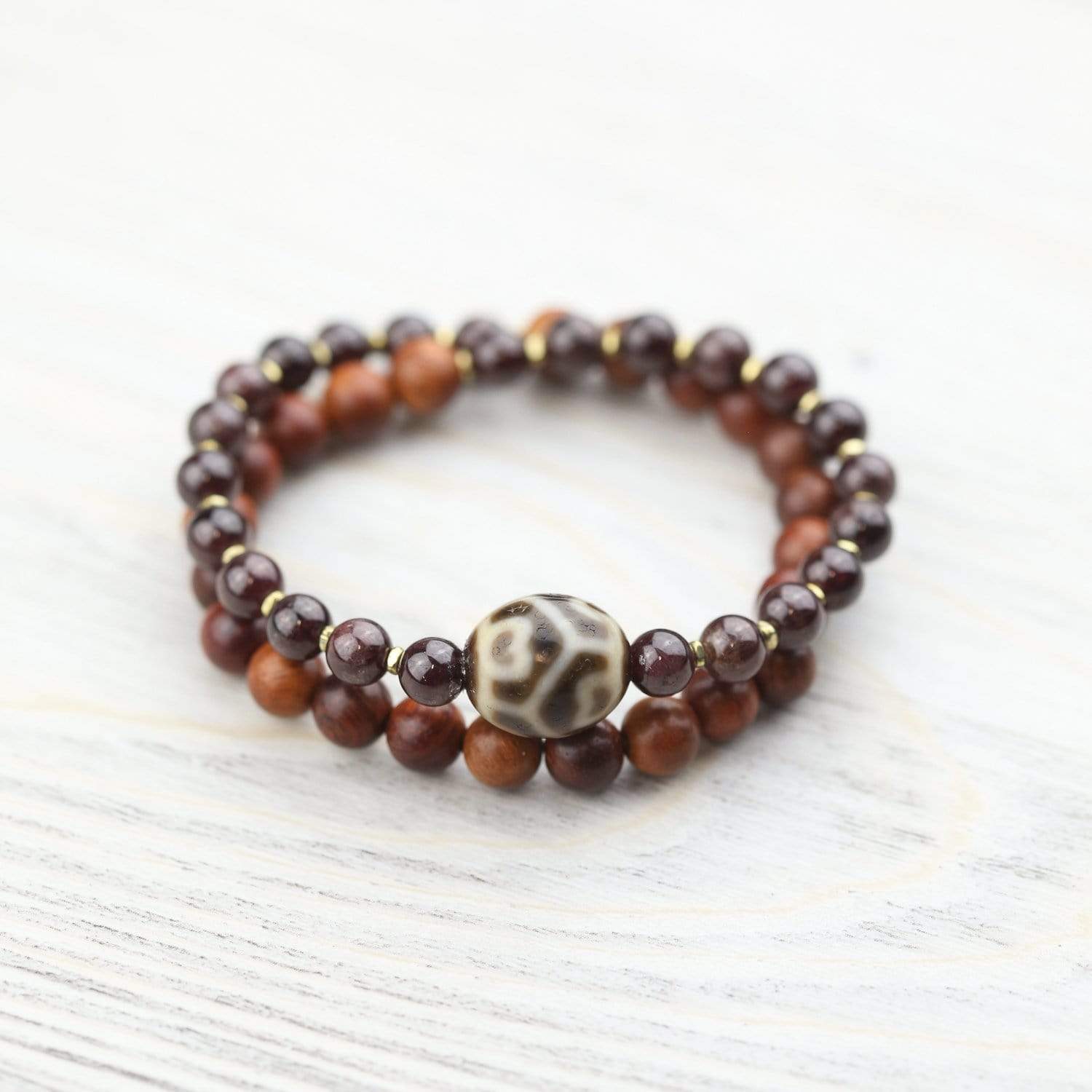 Wood beads are 8mm, garnet beads are 6mm. Dzi measures about 14-16mm.