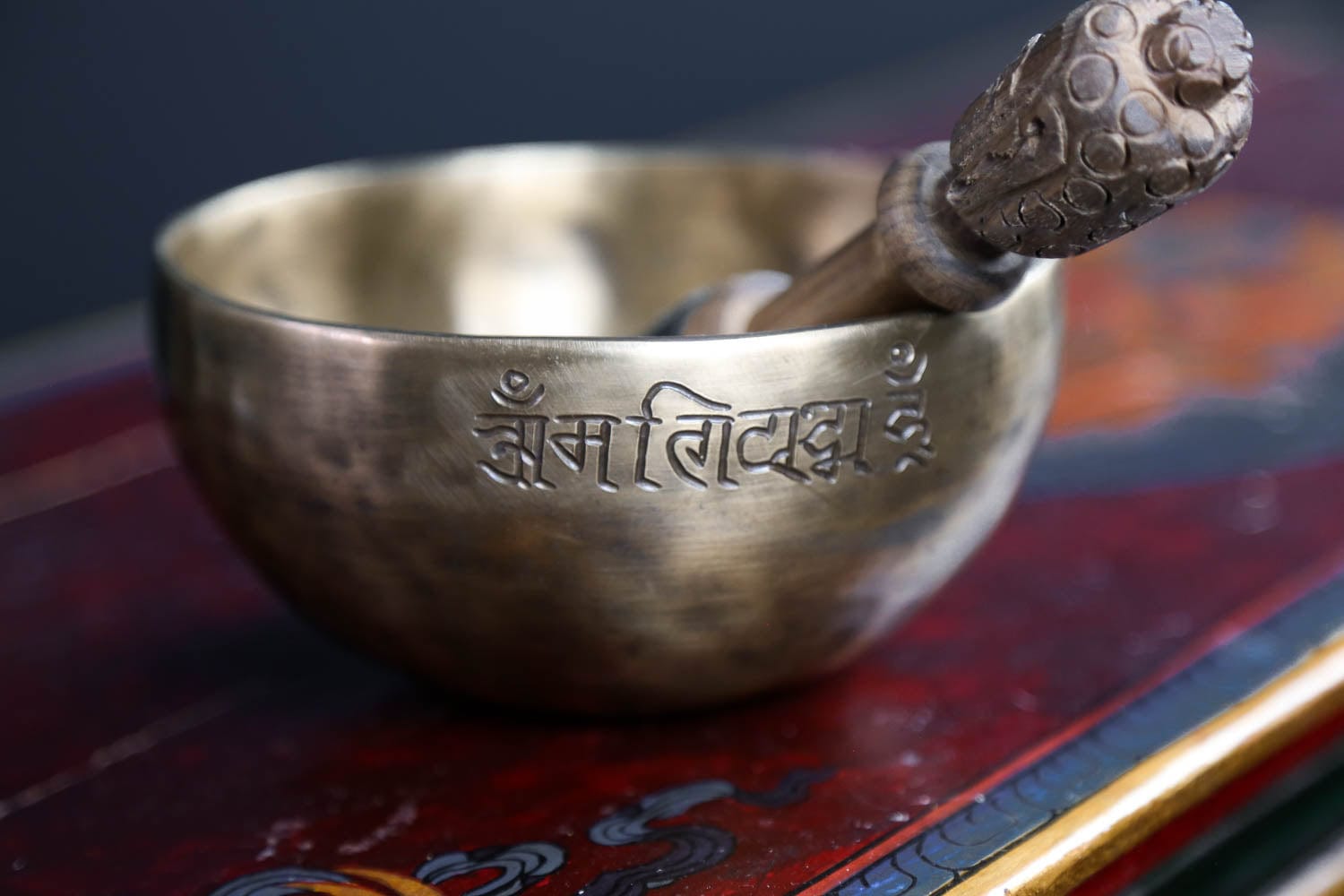Each bowl features gorgeous hand carved details including an exclusive full moon singing bowl stamp and the mantra of compassion in Tibetan script.  The mantra invokes the powerful benevolent attention and blessings of Chenrezig, the embodiment of compassion.  The full moon singing bowl stamp is also known as the symbol of longevity and happiness.