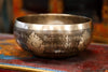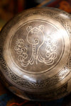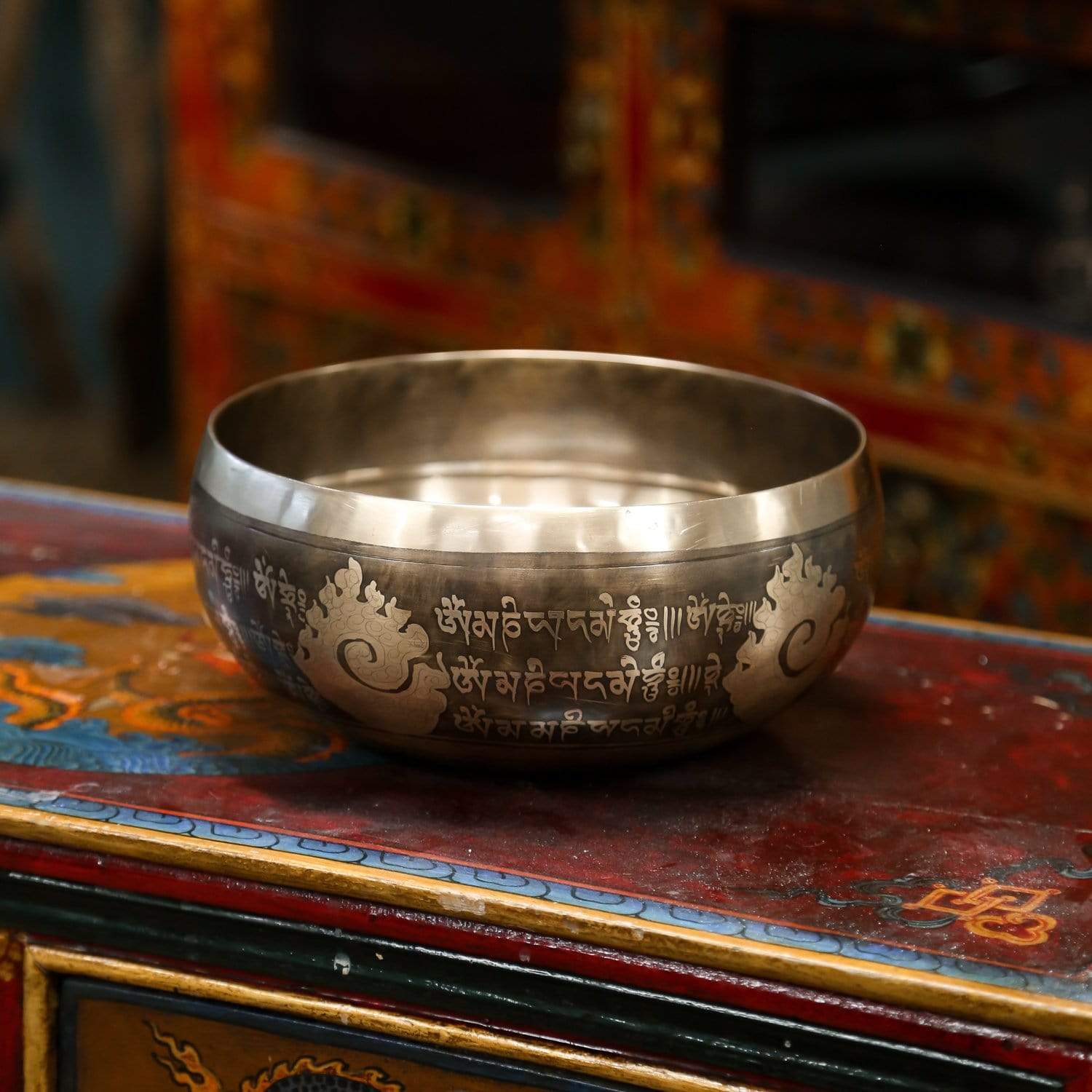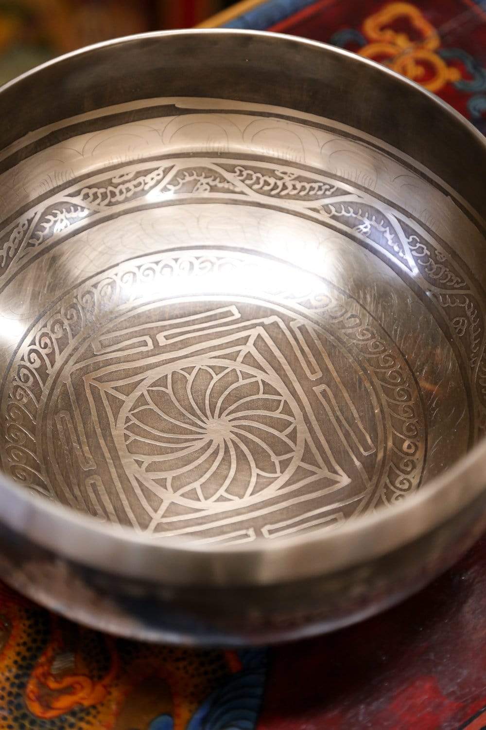 • An incredible hand etched Tibetan singing bowl with an amazing amount of detail and a special contrasting finish.  It features the mantra of compassion, a Tibetan mandala, and a conch shell design.