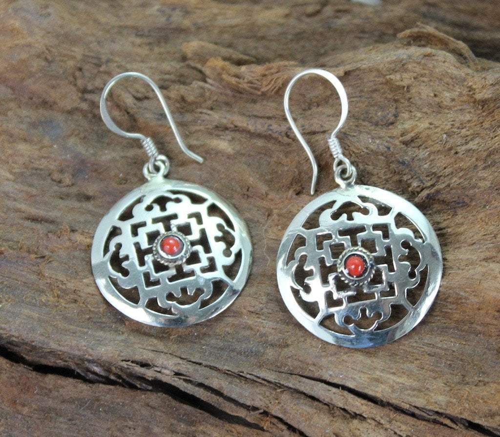 Solid silver with delicate filagree design inset with coral. Handmade in Nepal.