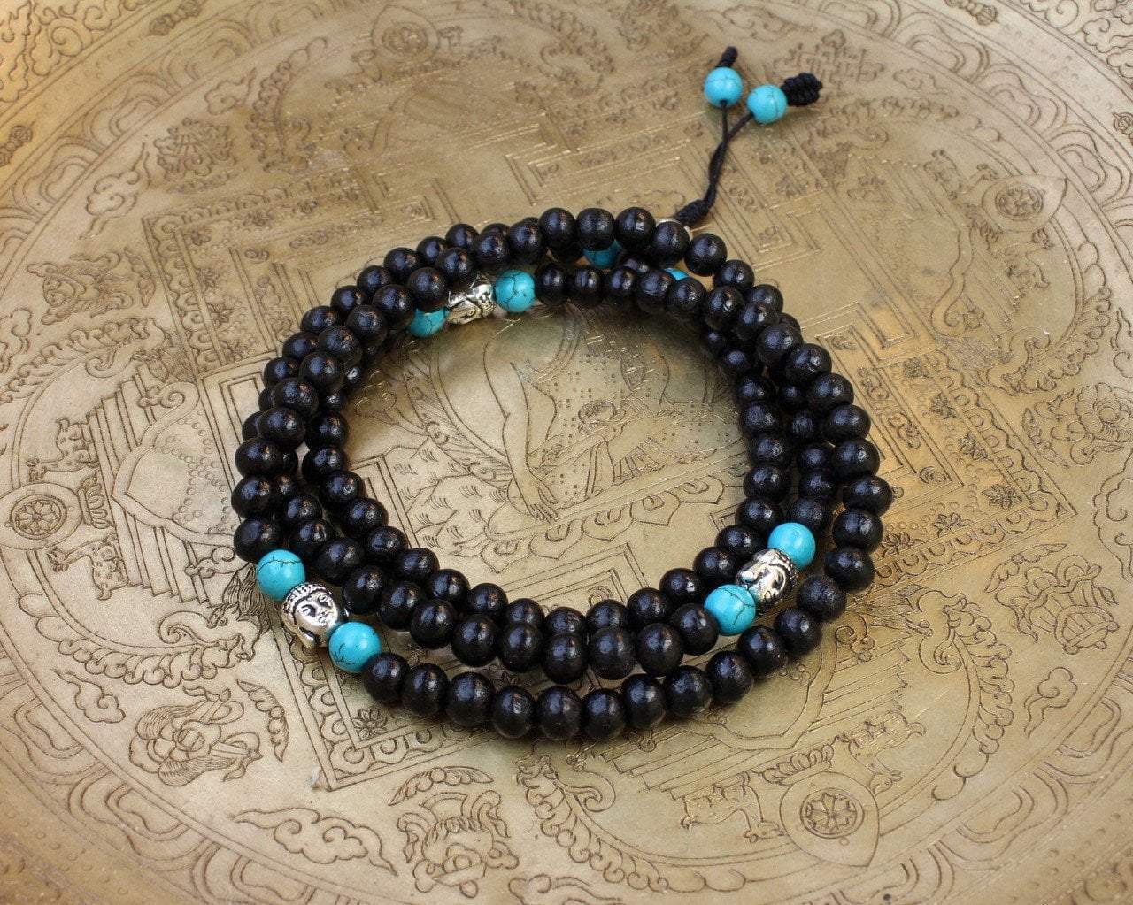 Beautiful rosewood mala featuring pressed turquoise and Buddha charm spacers.  Strung on black cord.  Perfect for everyday meditation.
