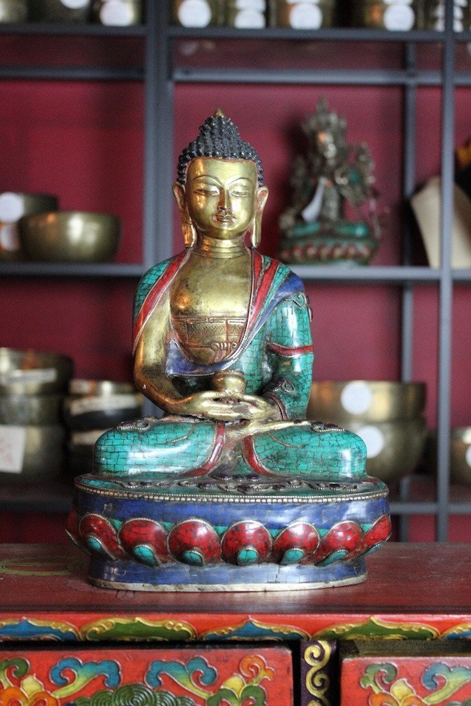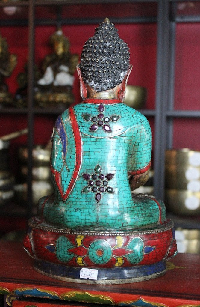 This exquisite Amitabha statue is handmade in Kathmandu, Nepal by the Shakya family.  This family has been making bronze statues for many generations and is well known all over the world.  Each bronze statue is made using the lost wax method, which takes considerable time and skill.  After casting each statue is hand detailed and carved by master craftsmen and women.  The statue is painted with gold and inlaid with turquoise and gemstones.