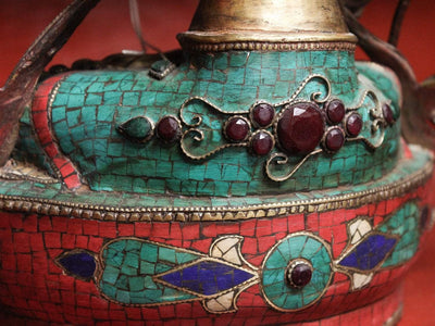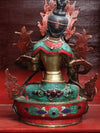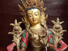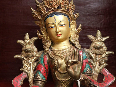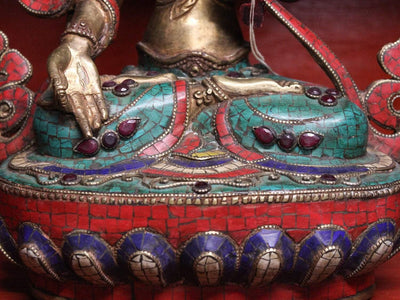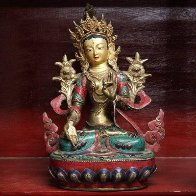 This exquisite White Tara statue is handmade in Kathmandu, Nepal. Each statue is made using the lost wax method, which takes considerable time and skill. After casting, each statue is hand detailed and carved by master craftsmen and women. The statue is then polished, inlaid with mosaic tiles and gemstones, and finally, her face is completed with gold paint and fine details.
