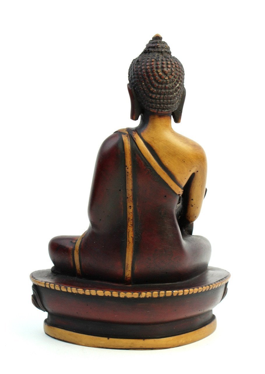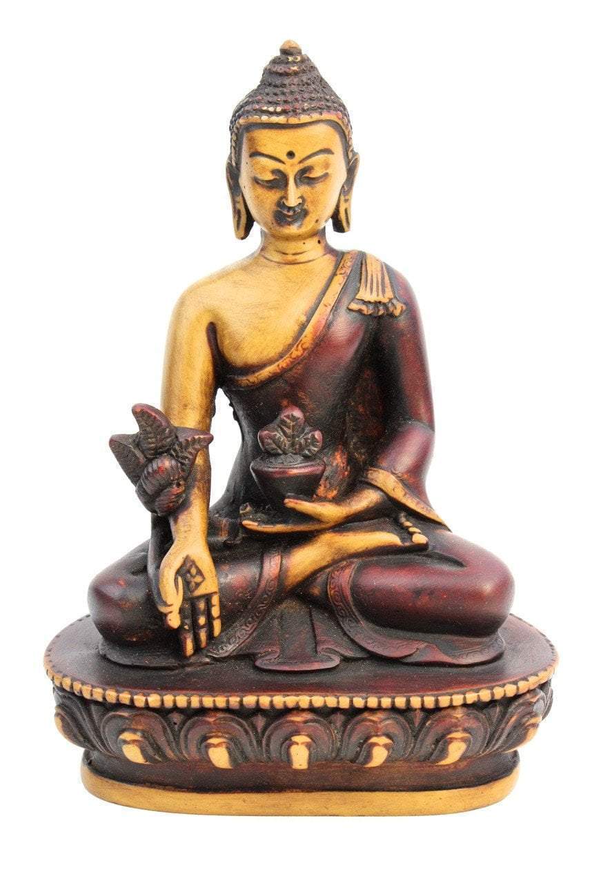 Our painted Medicine Buddha statue is handmade in Nepal by master sculptors. It is cast using hand sculpted molds and made of natural tree resins before being finished with hand painted details. It's a great addition to any altar area, meditation space, home, or office.