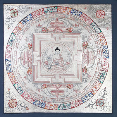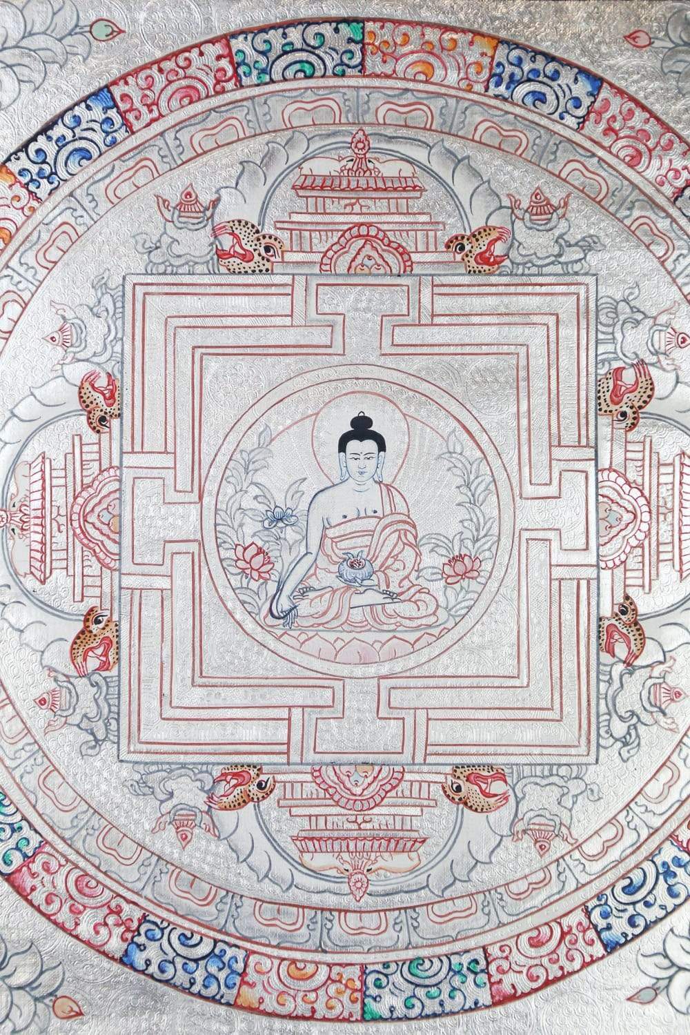 Each detail is painted by hand on cotton canvas using natural mineral and vegetable pigments with silver accents. The intricate brushstrokes and extraordinary detail make these thangkas genuine works of art. It comes unframed and ready for Western style framing of your choosing.