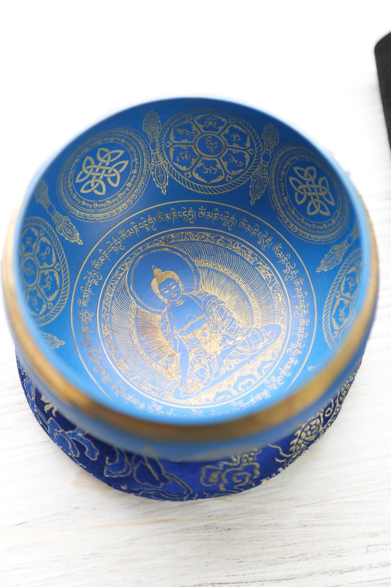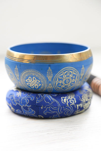 Featured on the inside rim of the bowl is the Om Mani Padme Hum mantra inside of lotus petals, invoking compassion, wisdom, and protection from negativity.