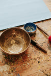 Your bowl comes with a wood and suede striker and blue brocade ring cushion hand stitched and stuffed with up-cycled materials.Includes a DharmaShop keepsake bag.