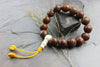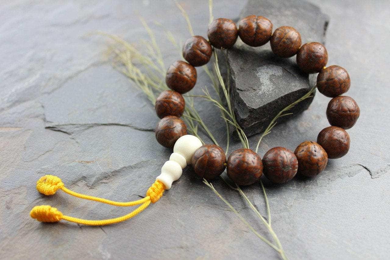 One of our largest bodhi seed wrist malas accented with a bone guru bead and yellow cord. 13mm Bodhi Seeds with bone guru bead and yellow cord.