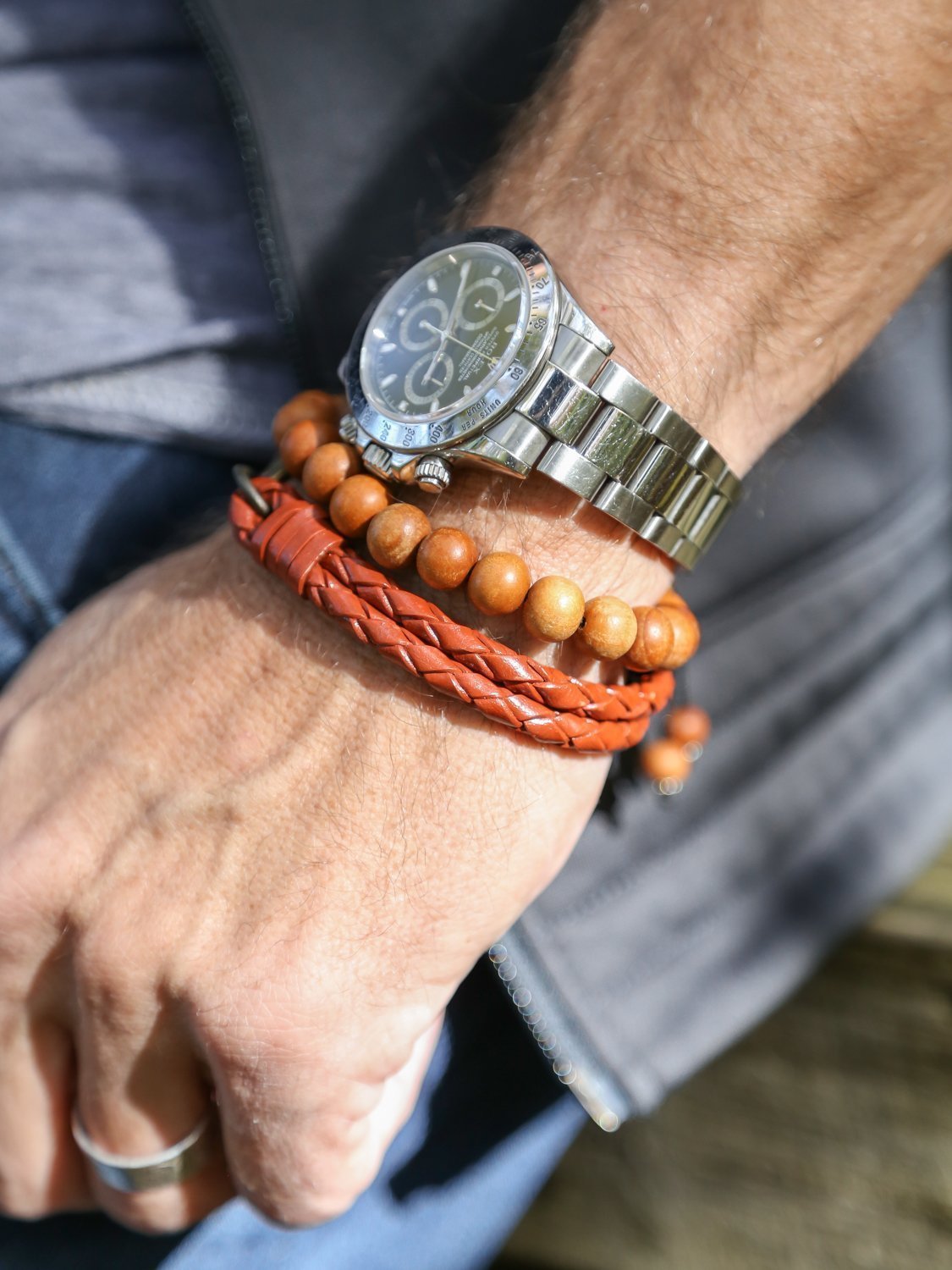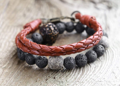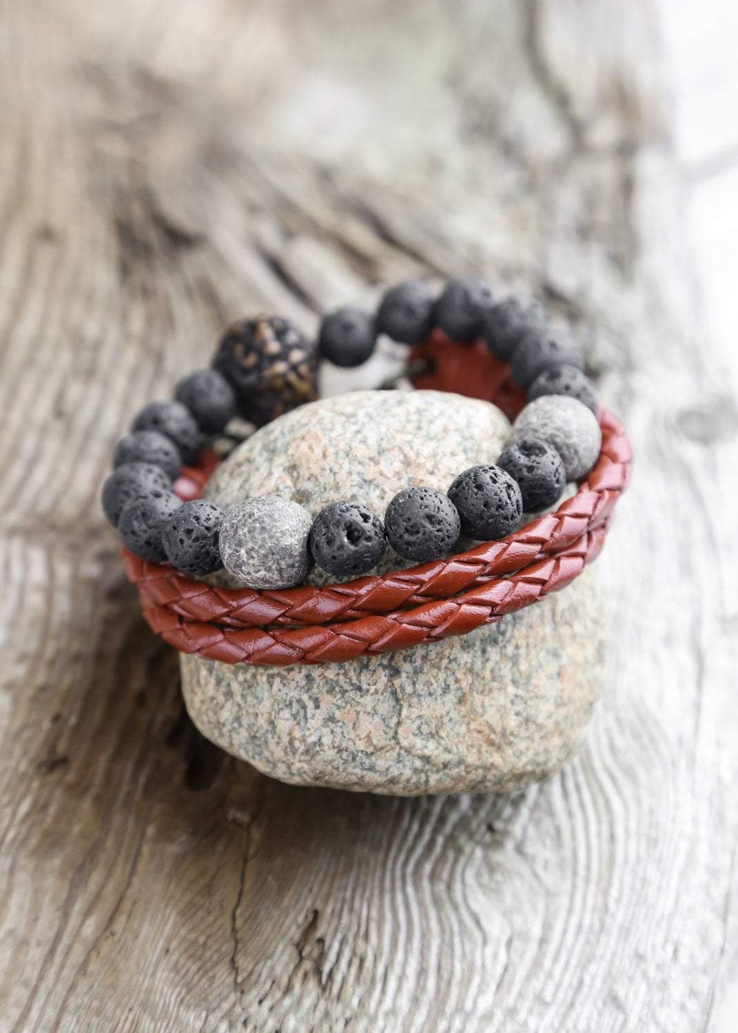 Photo shows this leather bracelet stacked with our Resilient Spirit Lava Rock & Mastodon Wrist Mala and Grounding Natural Wood Men's Bracelet.
