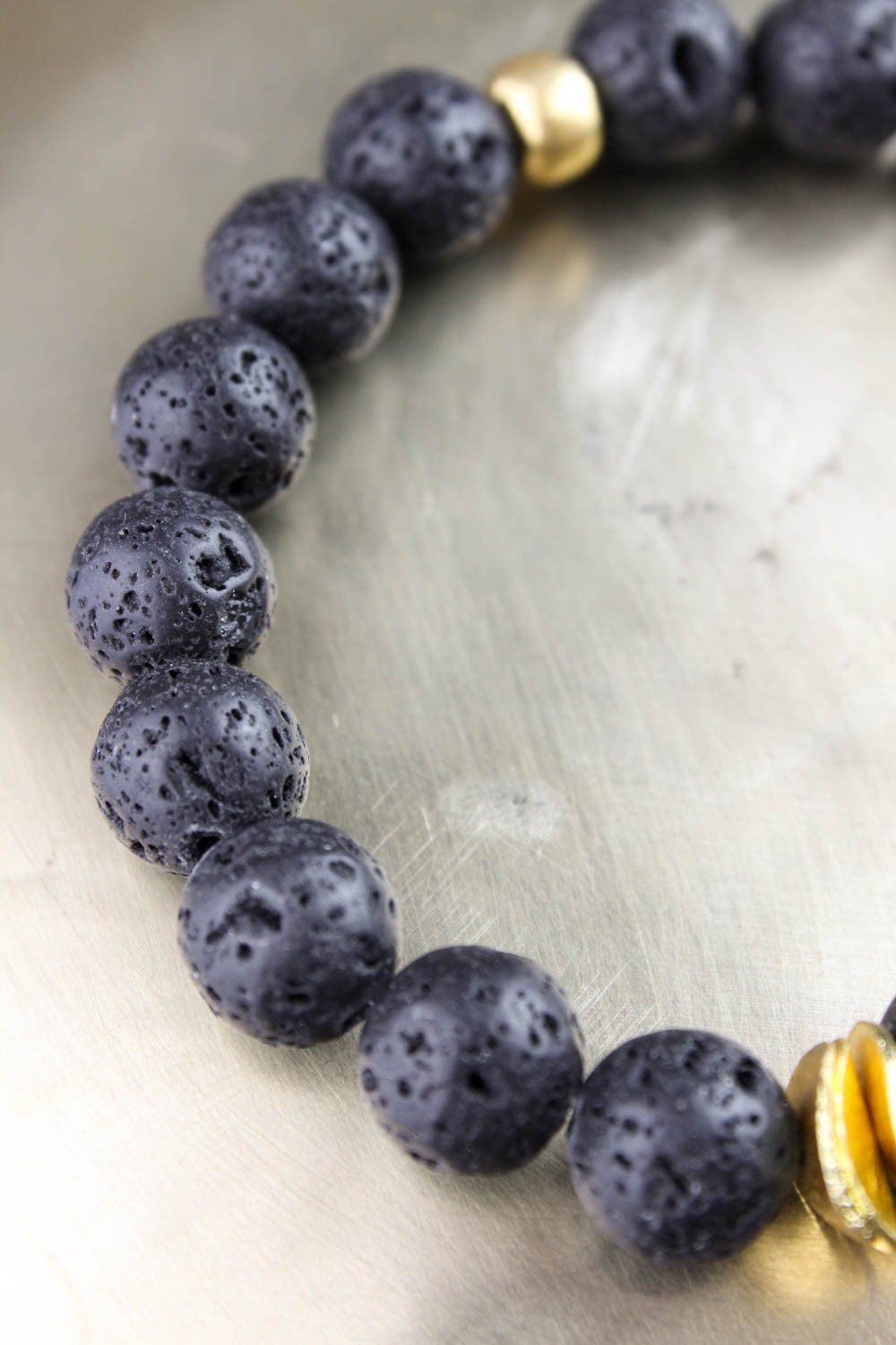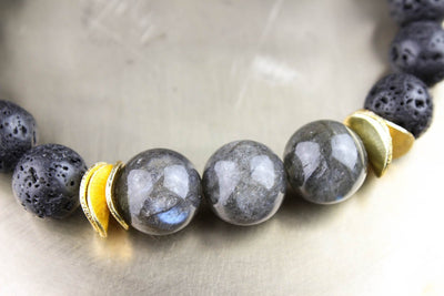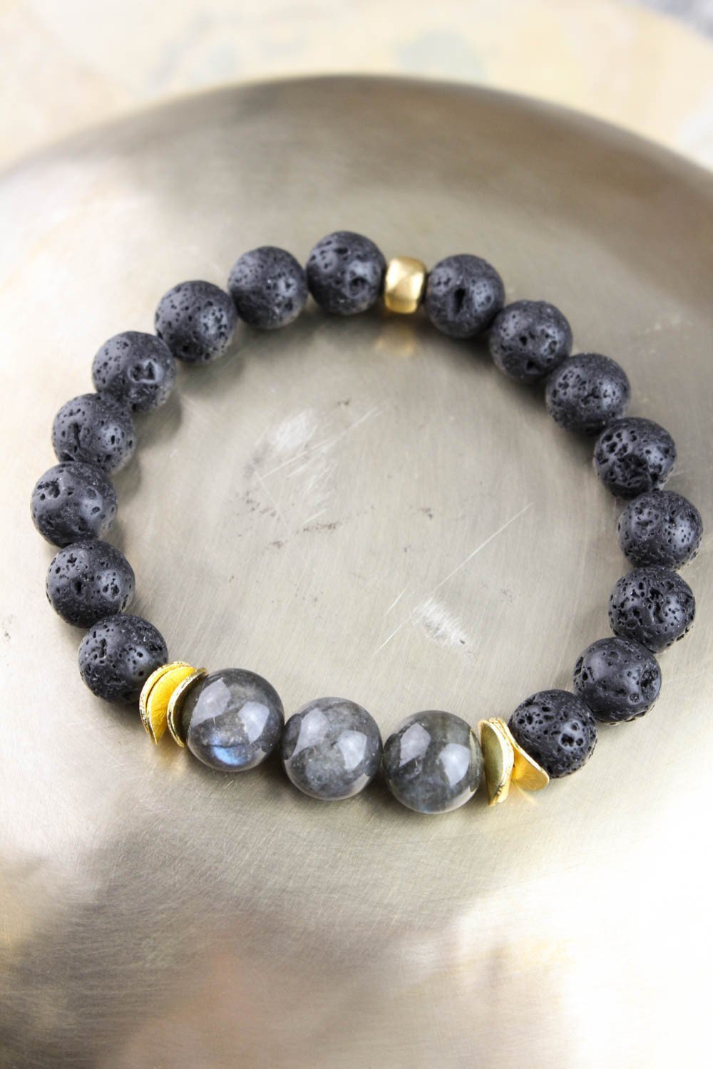 New and exclusive men's bracelet features impressive matte black lava rock beads, as well as 3 labradorite center pieces. It looks great on its own or worn in a stack.