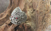 Size:This is a sized ring. Availability is limited. White metal with faceted garnet eyes.