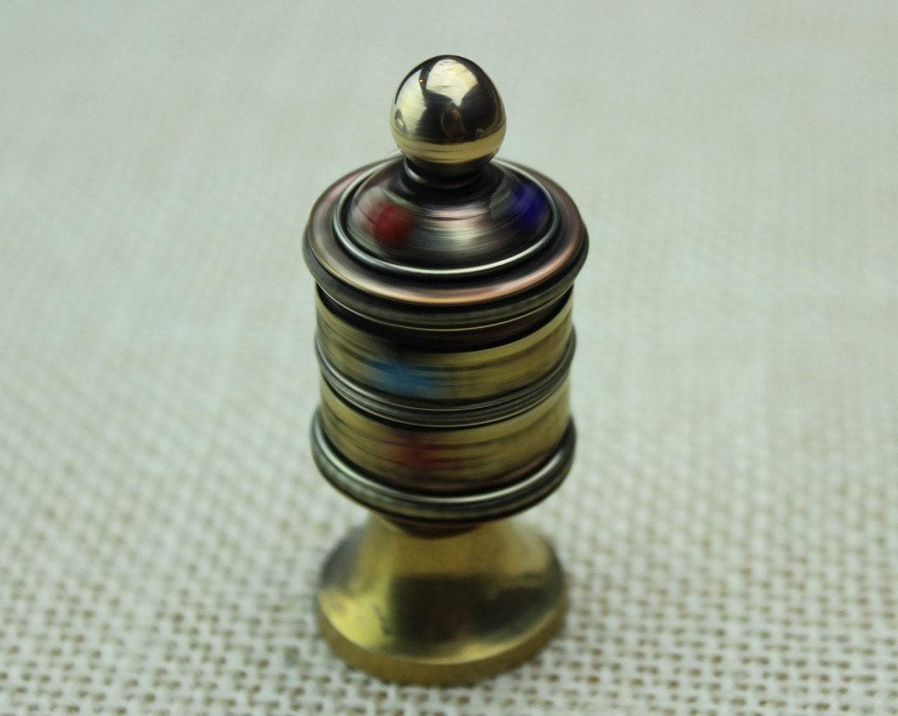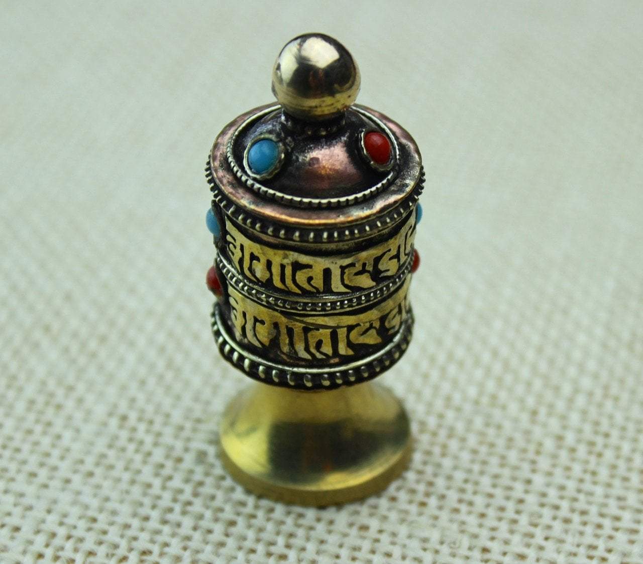 Temples in Nepal and Tibet have hundreds of these similar hand carved prayer wheels in bigger form. They are turned clockwise and contain prayers inside the wheel to multiply the prayers with each turn.