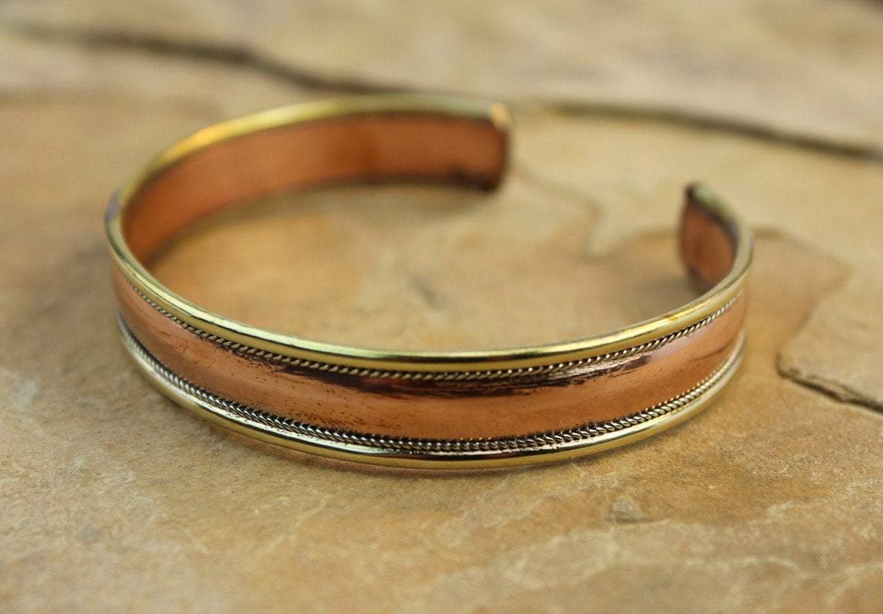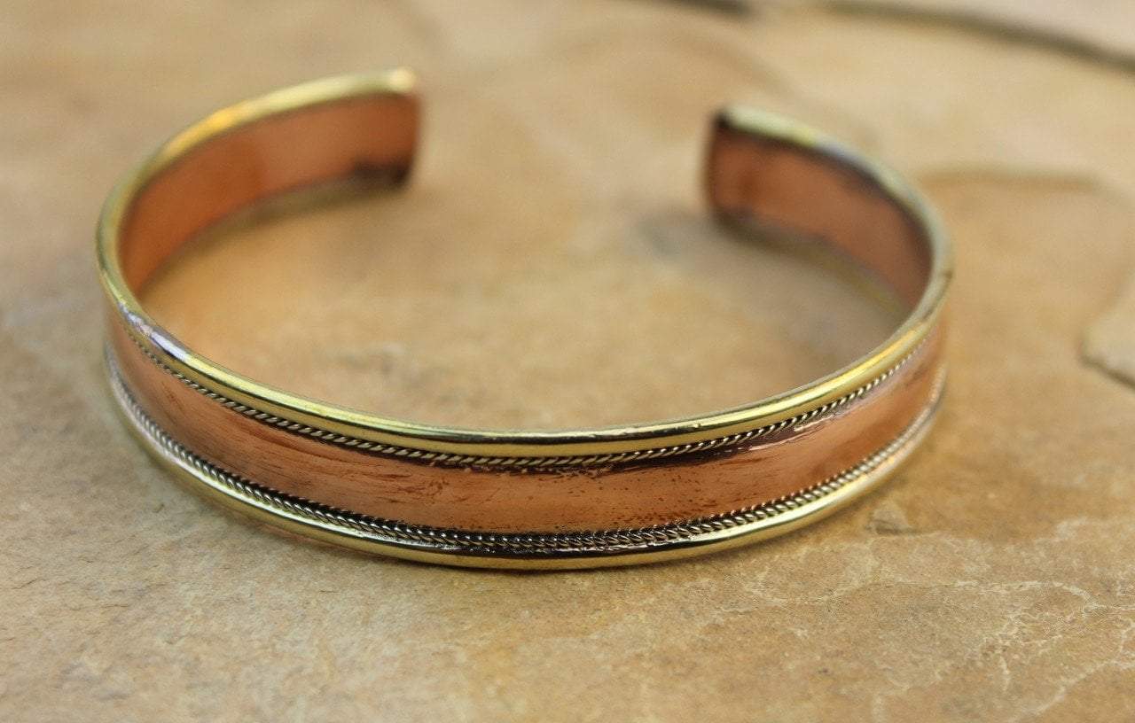 Copper and brass mixed metal cuff bracelet. Hand made in Kathmandu, Nepal.